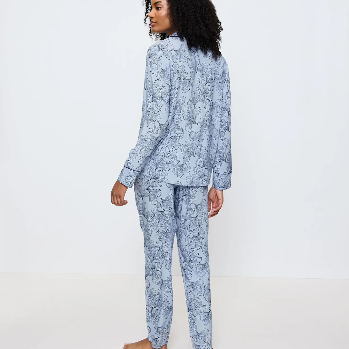 Langærmet Boyfriend-pyjamassæt med afslappet pasform, klassisk krave og kontrastfarvede kantebånd. Designet med blødt, åndbart stof.