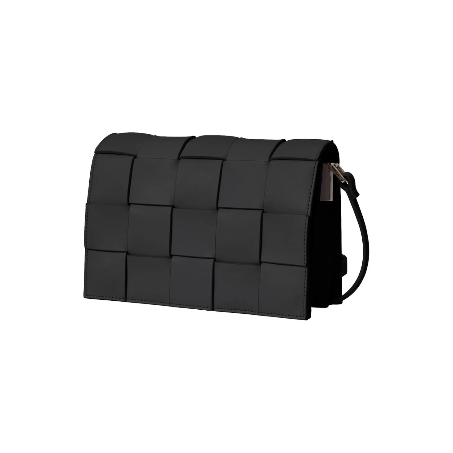 Ensfarvet Cross Body Taske i PU med flettet flap og trykknap. Justerbar skulderstrop. 3 indvendige rum, 1 med lynlåslomme.