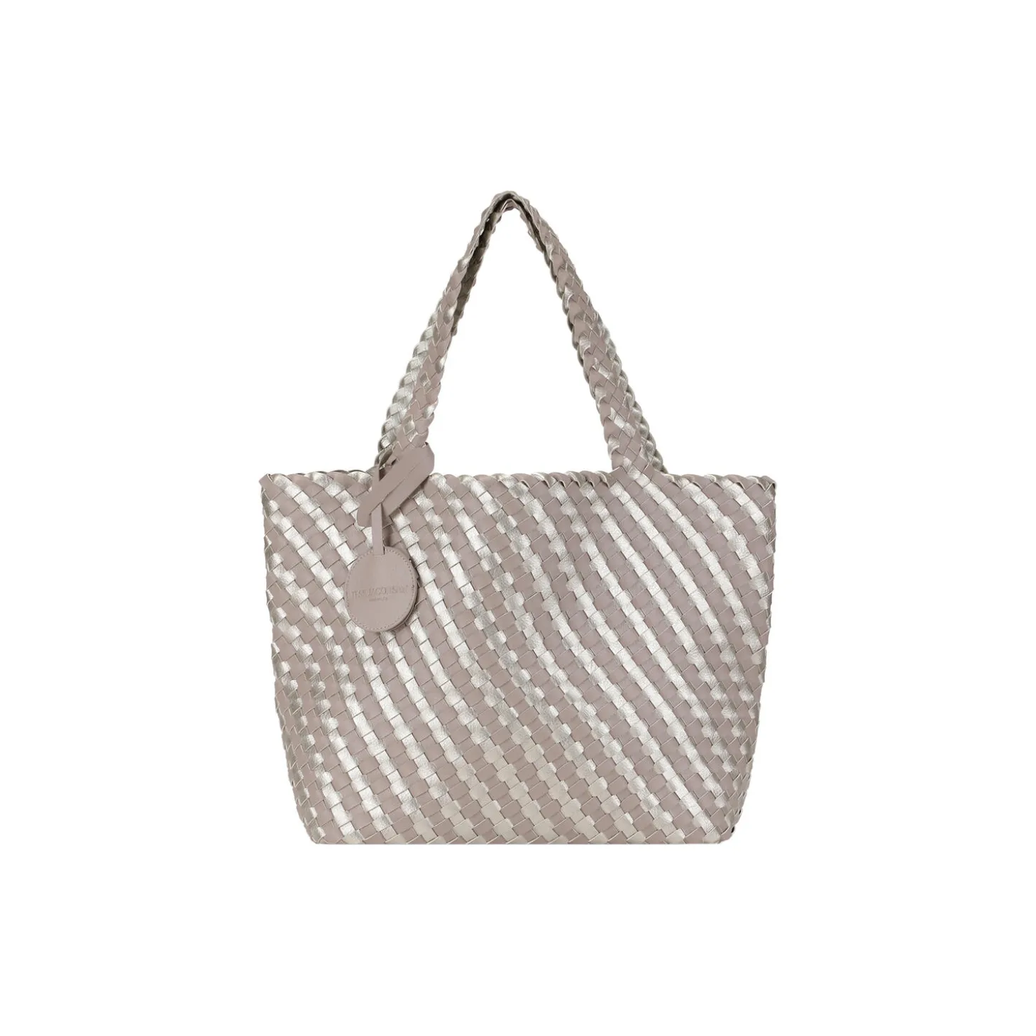 Reversible braided shopper is crafted from braided soft faux leather, this bag offers you two stunning looks in one. The bags reversible design, has a mix of two colors on one side and one solid color on the other, and is complemented by a matching logo tag with a concealed snap hook, which allows you to easily secure your wallet or keys to get lost in your bag.