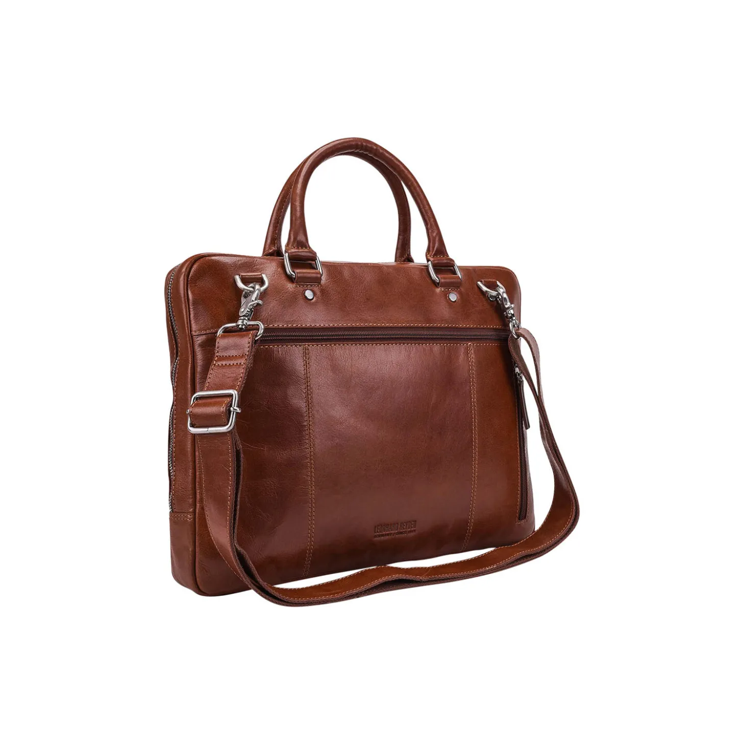 Lækker computertaske i 100% læder. Et stort rum med plads til bla. 15” Laptop, kuglepen, papirer etc. Justerbar skulderrem medfølger samt rem til at sætte fast på en kuffert.