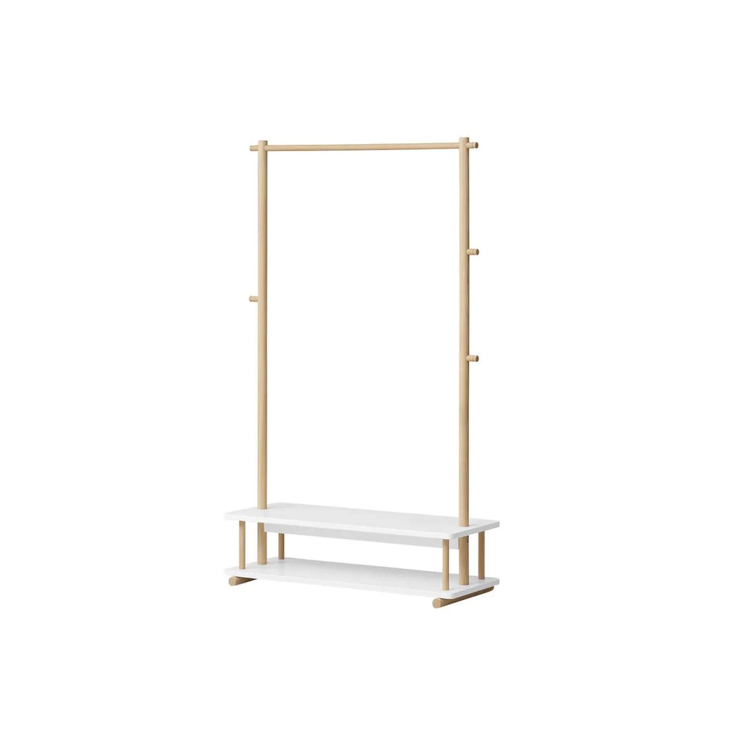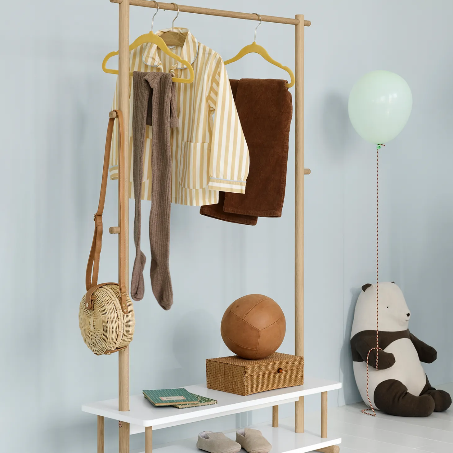 Camp tøjstativ minder i design om himmelsengens ramme, og har plads til såvel balletsko som vandrestøvler på de to hylder forneden. Finurlige detaljer som små runde knager på ydersiden af de smukt formede rundstokke i eg gør det let for børnene at få adgang til og organisere alt fra regntøj til usynlighedskapper.