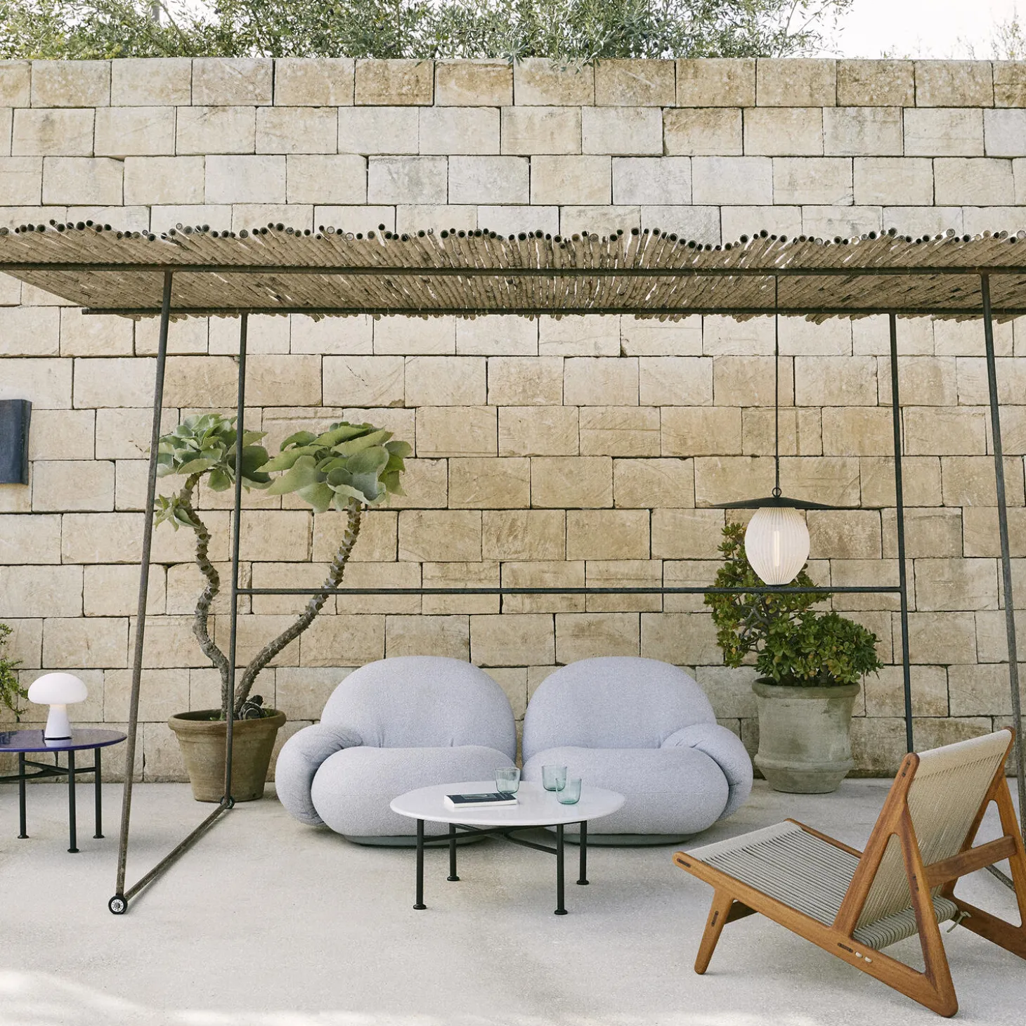 Carmel Coffee Table i glaseret stentøj og pulverlakeret galvaniseret stål fra GUBI. Farve: clam white. Mål: H: 32 x L: 75 x B: 75 cm. Design: OEO Studio.
