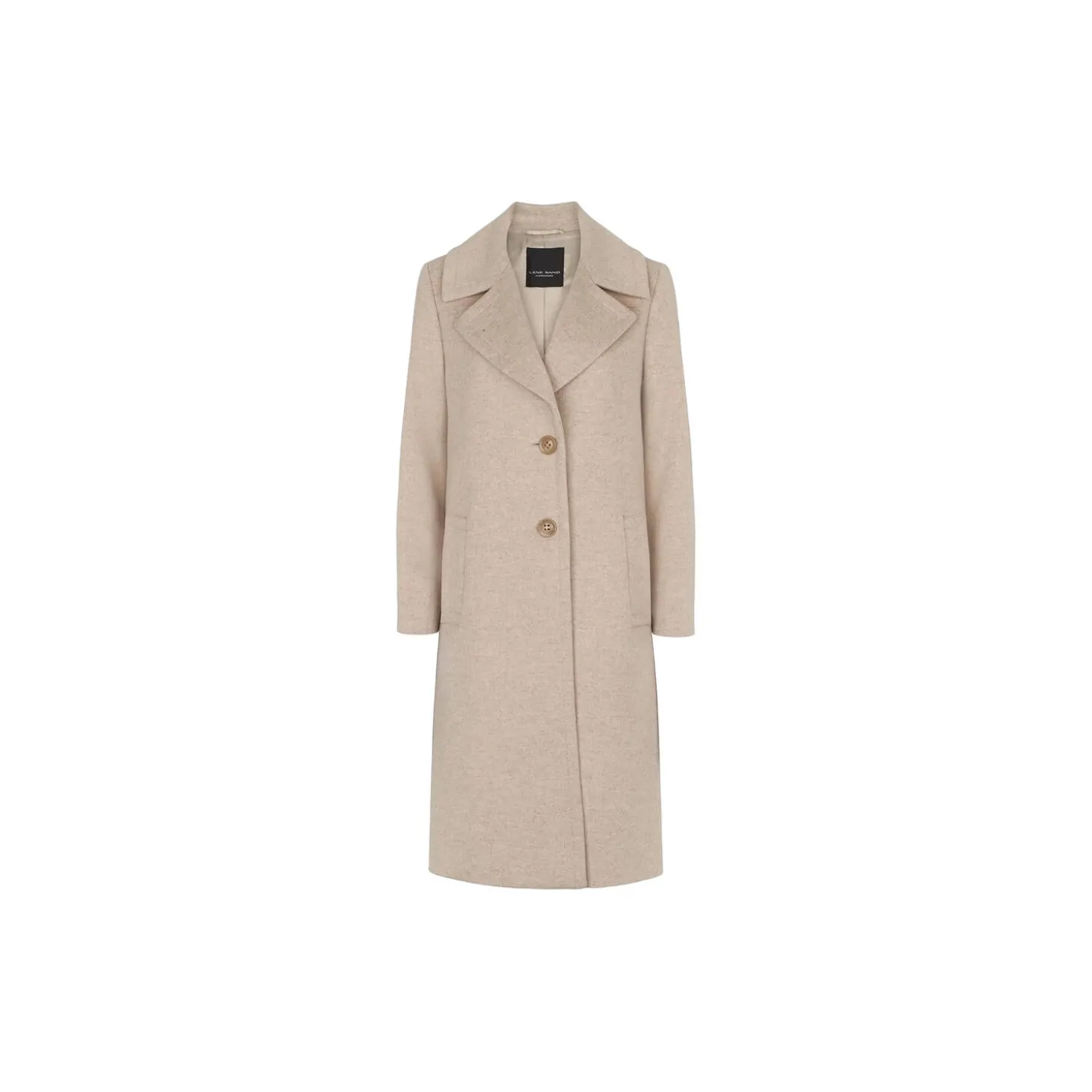 Belted coat with extra large lapel. Softly padded shoulder. Tonal fabric belt and large side pockets. Midi length
