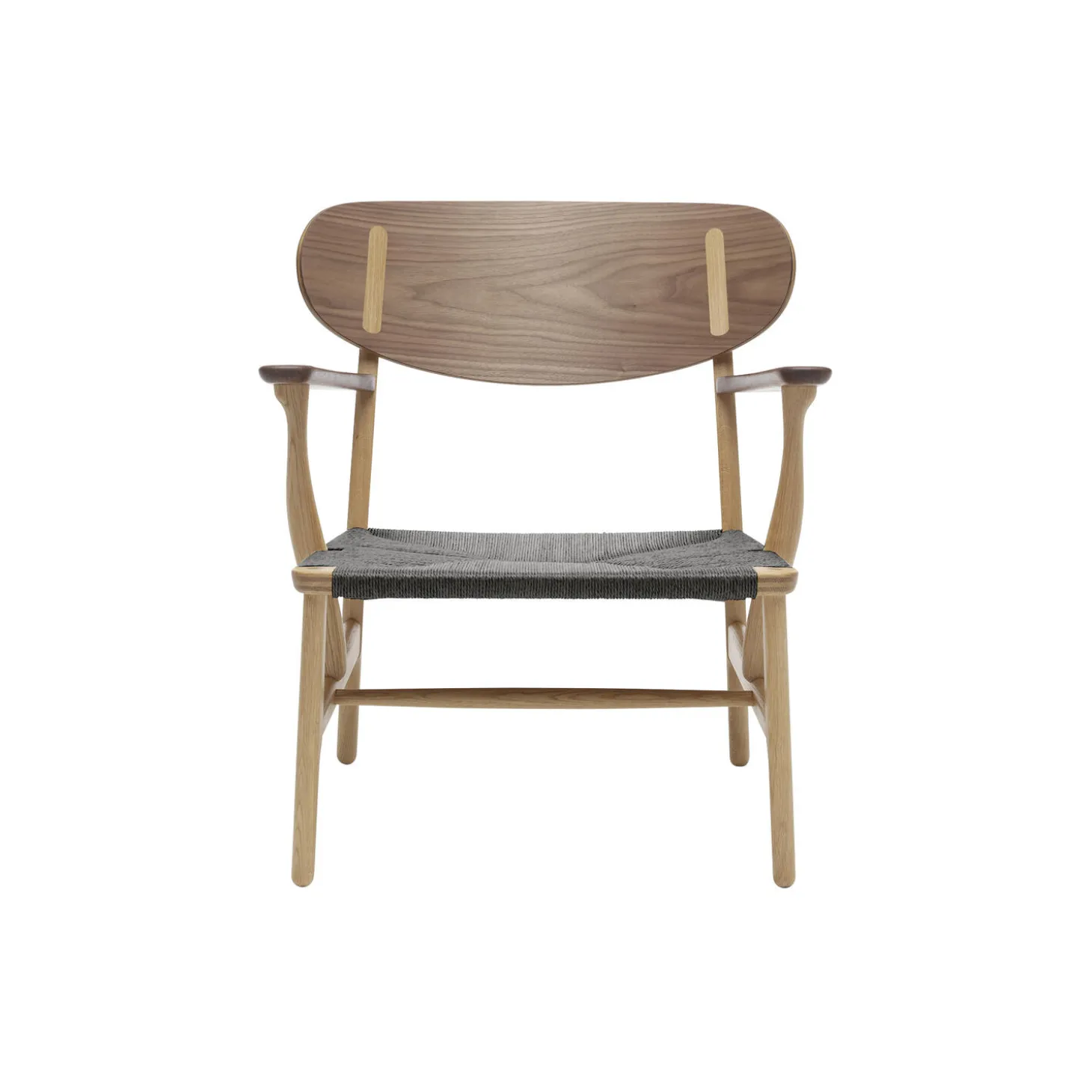 CH22 loungestol i olieret eg med ryg- og armlæn i olieret valnød med sæde i papirgarn fra Carl Hansen & Søn. Farve: olieret eg/olieret valnød/sort. Mål: H: 72,6 x B: 69,5 x D: 61,5 cm. Siddehøjde: 36,8 cm. Design: Hans J.Wegner.