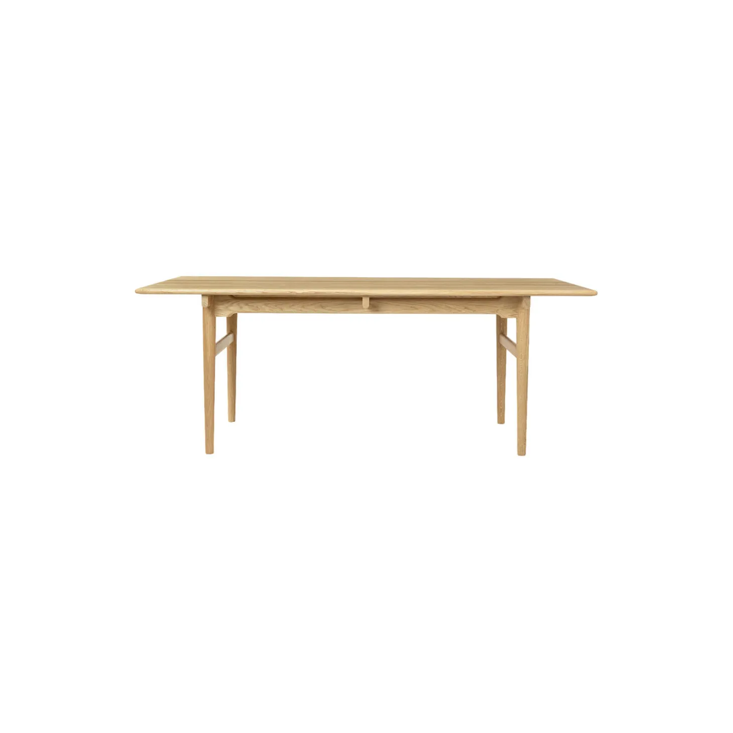 Hans J. Wegners CH327 spisebord til seks personer fra 1962 har et usædvanligt design med en bordplade, der nærmest syner svævende. CH327T tillægsplader tilkøbes seperat.