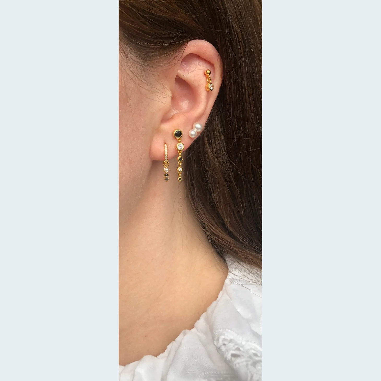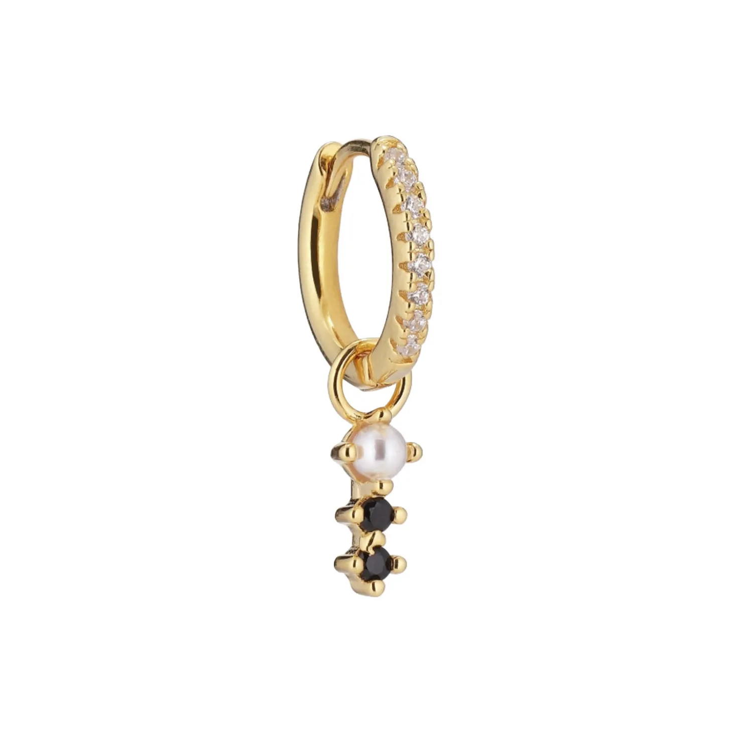 Huggie ørering med med charm. Øreringen har klare og sorte sten samt en lille shell perle. Sælges enkeltvis.
