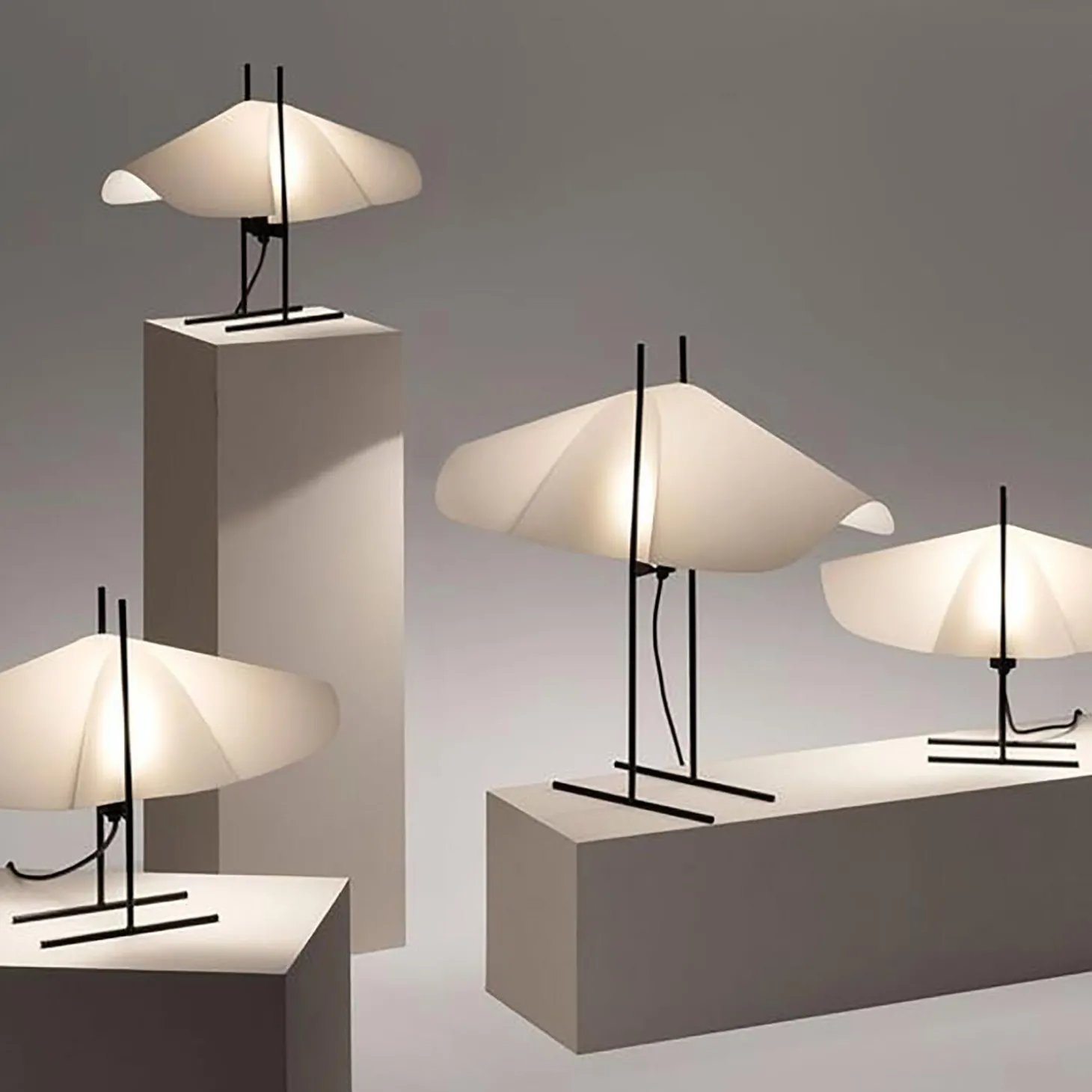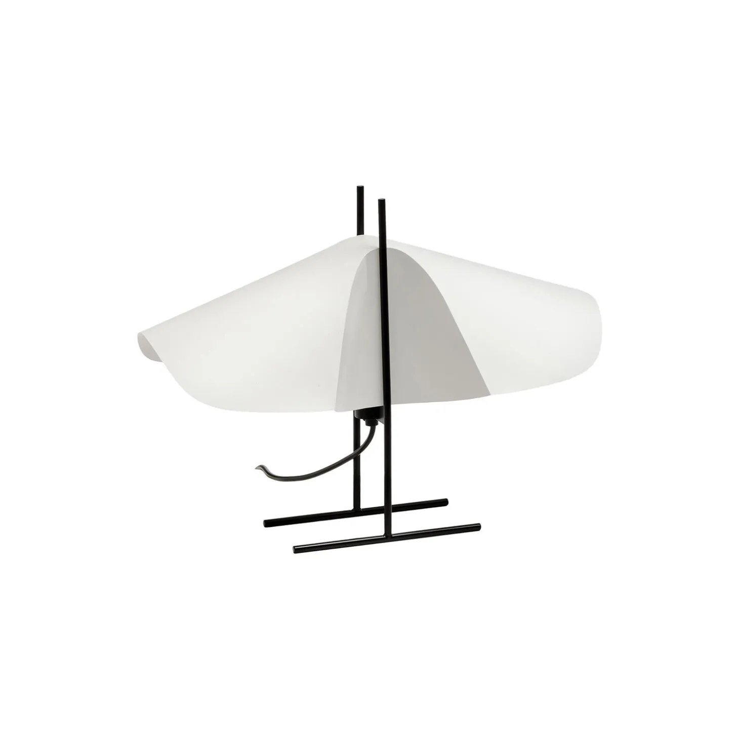 CHO lamps are the result of a study on shapes that appear when adding pressure to an oval piece of paper. A sheet with two curved pressings, gently wedged into a slim metal frame. As a wing catch carrying itself resiliently between two pylons. Here it unfolds into a poetic shade that spurs on creative interpretation of the beholder and changes at the point of view