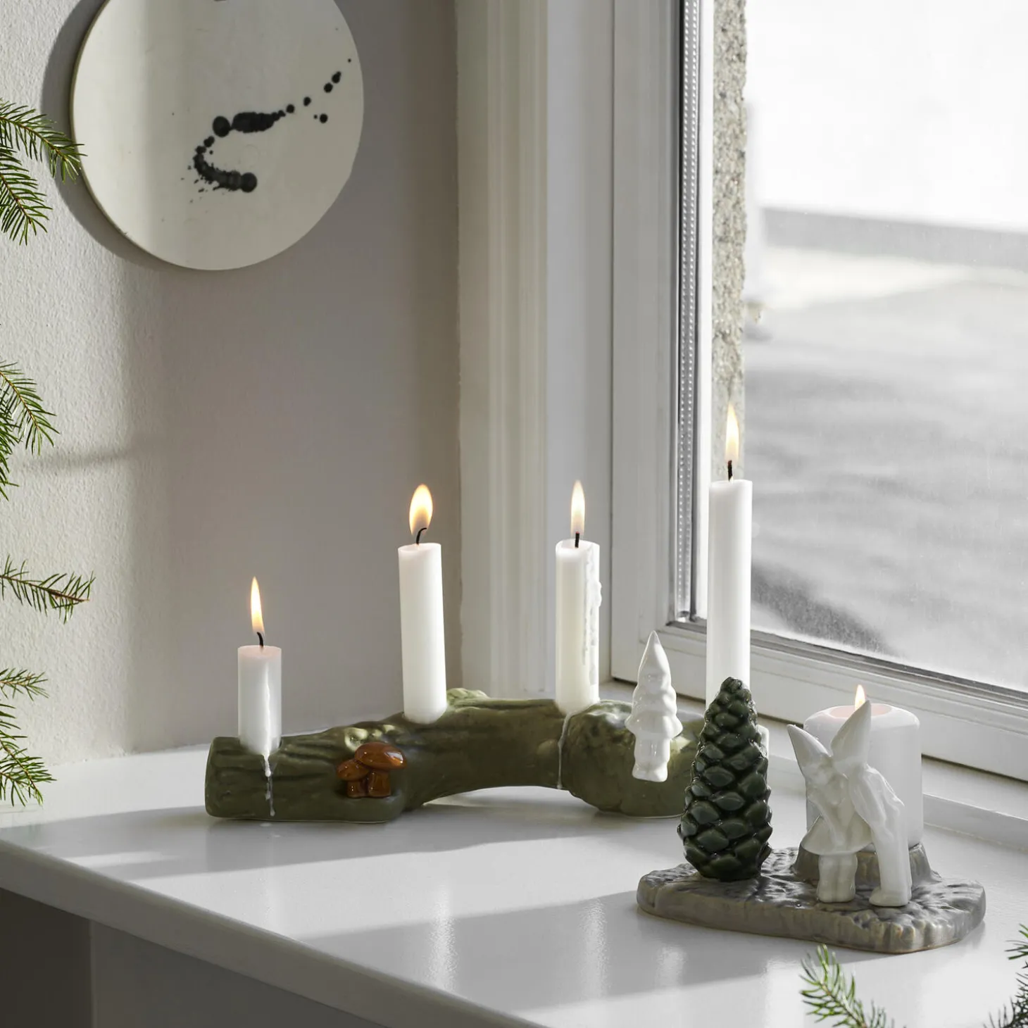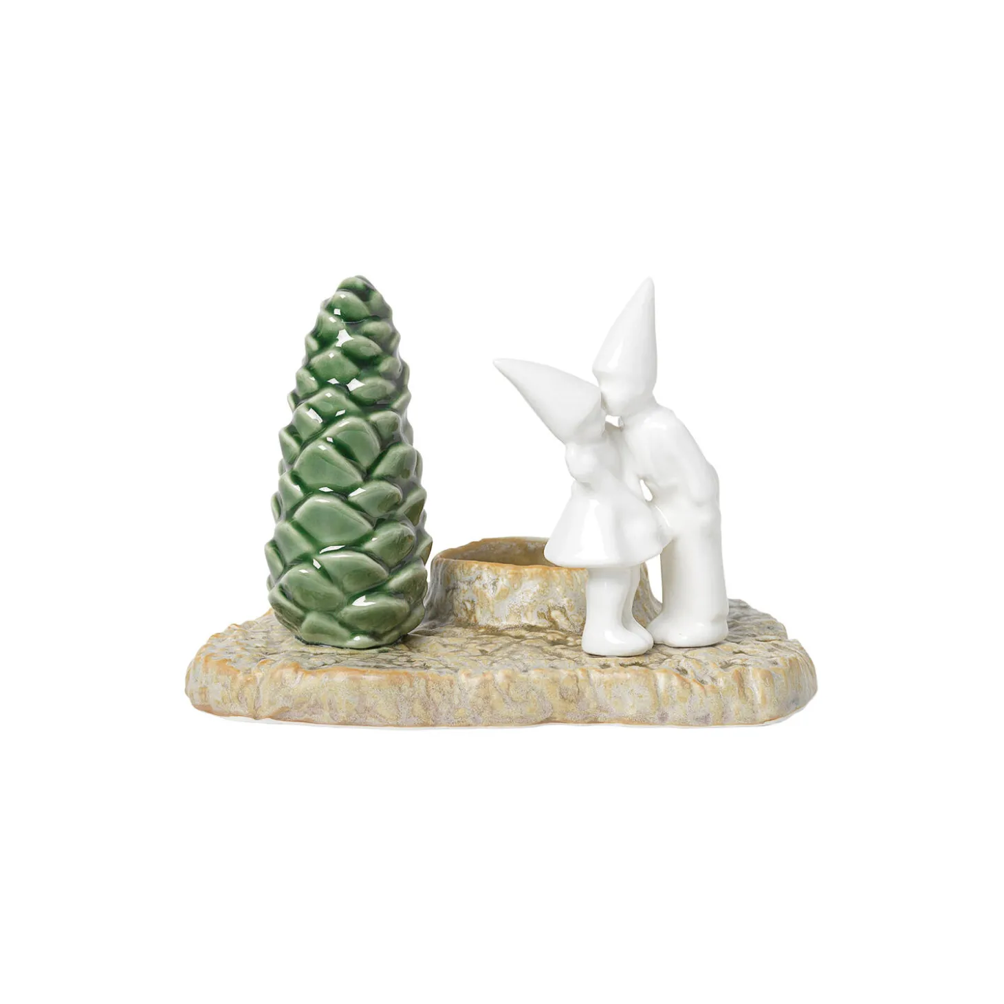 De dekorative porcelænsfigurer i Christmas Tales kollektionen er fulde af julemagi. De er inspireret af gamle julefortællinger, og hver af dem fortæller en historie med elementer fra den smukke nordiske natur. Formerne er skabt ved afstøbninger fra naturens overflader og træstubbe, hvilket skaber en smuk kontrast til de stilistiske figurer. Det søde lille par minder os om at give en gave fra hjertet, der ikke kræver nogen indpakning: et kys. Lad dem sprede kærligheden i lyset af et adventslys.