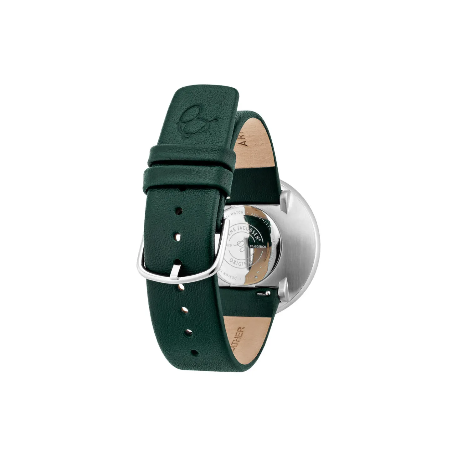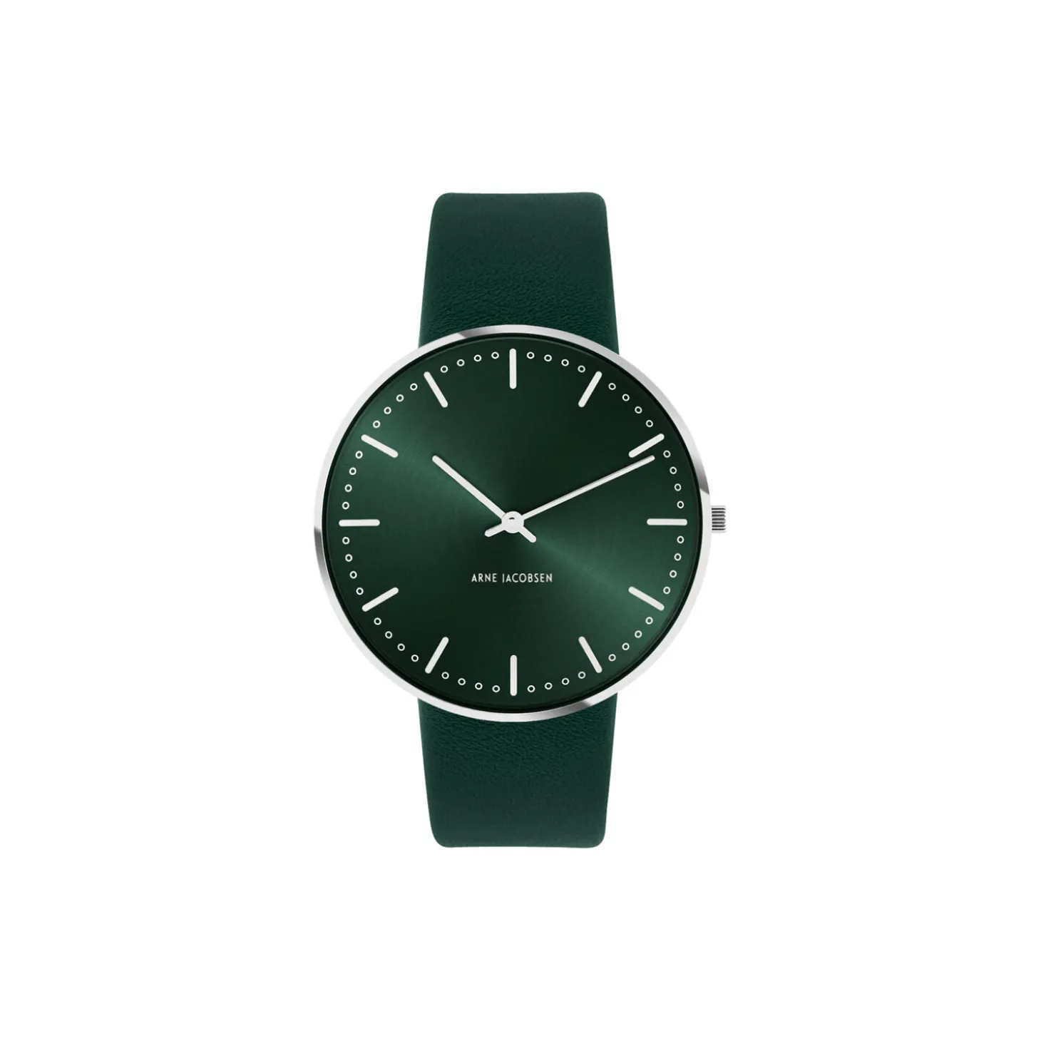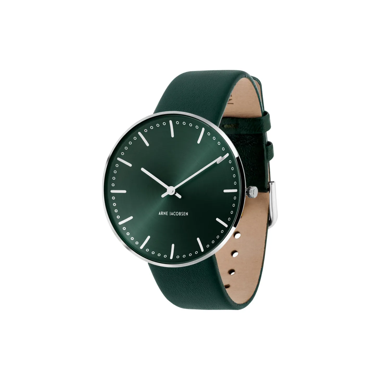 Arne Jacobsen City Hall wrist watch with Green 20 mm leather strap in calf-skin with polished steel buckle. The dial on this watch is 40 mm.