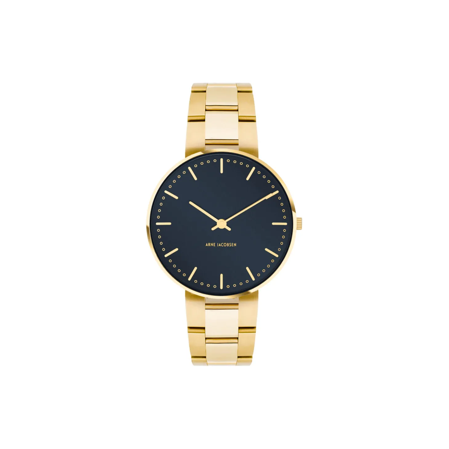Arne Jacobsen City Hall wrist watch with polished gold 16 mm bracelet with butterfly buckle. The dial on this watch is 34 mm.
