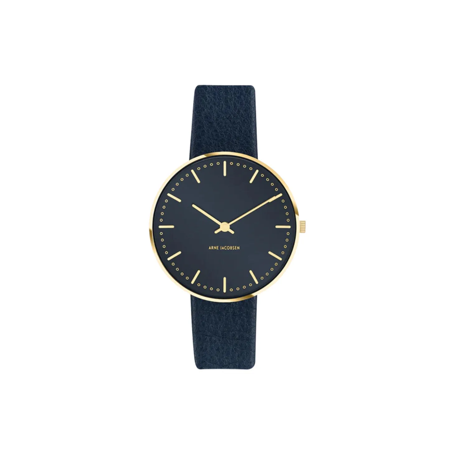 Arne Jacobsen City Hall wrist watch with oxford blue 16 mm leather strap in calf-skin with polished steel buckle. The dial on this watch is 34 mm.