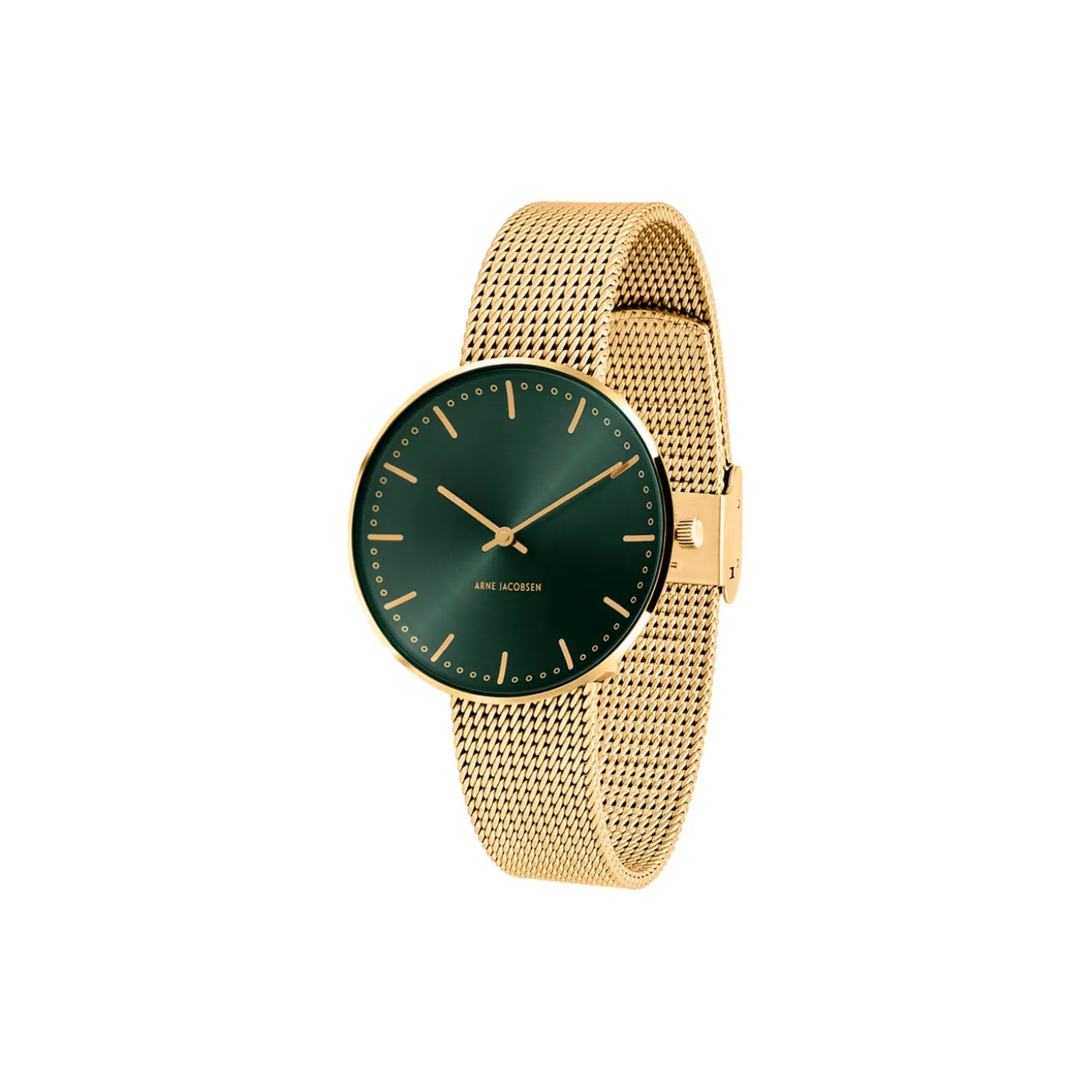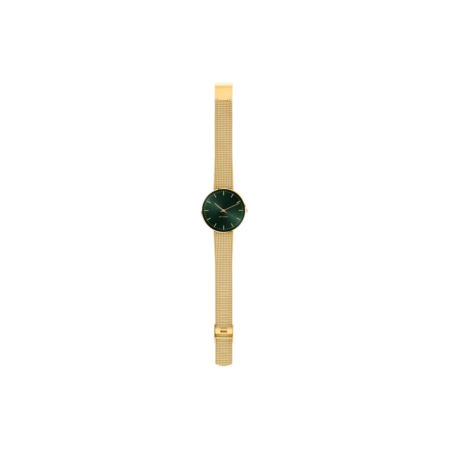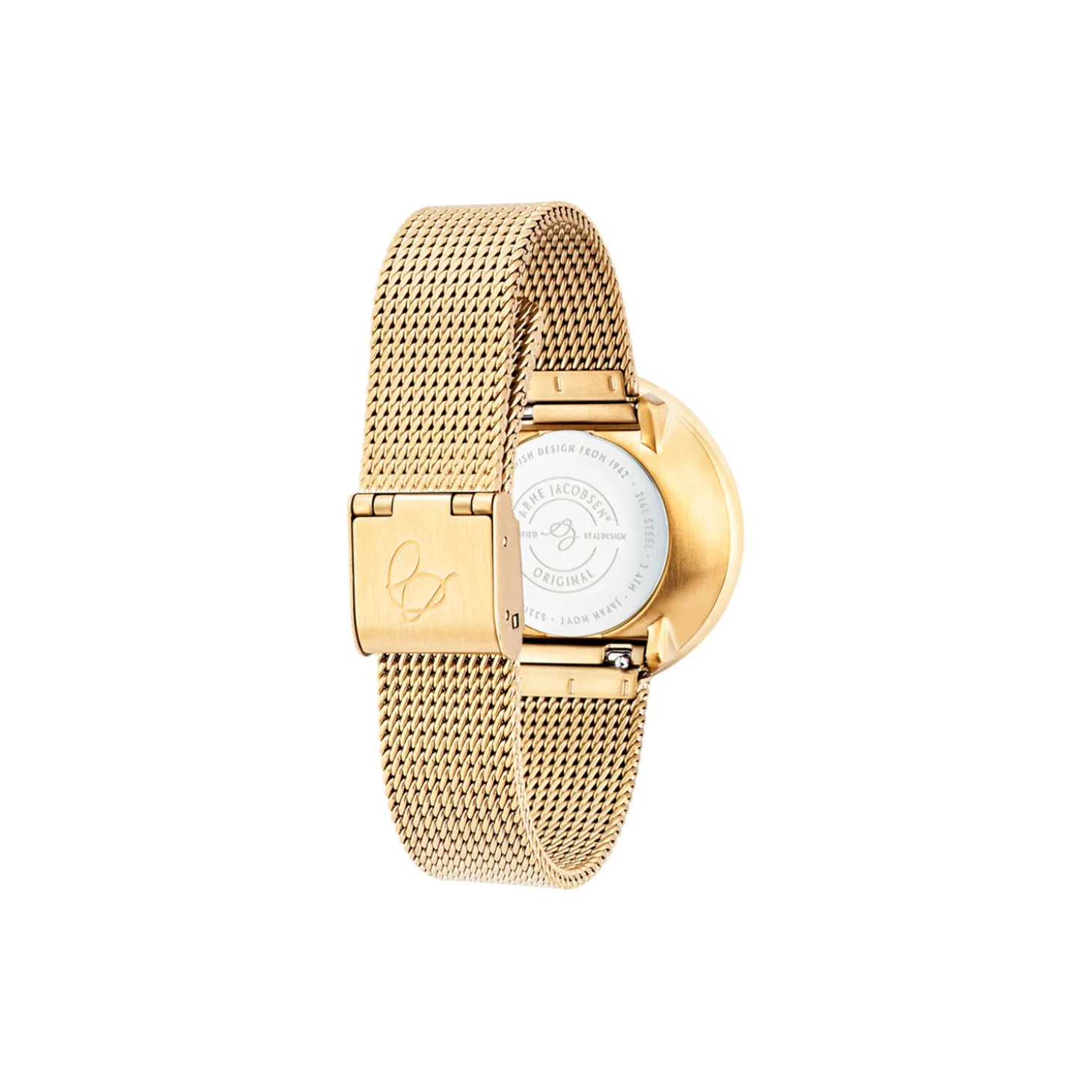 Arne Jacobsen City Hall wrist watch with matt gold 16 mm mesh band. The dial on this watch is 34 mm.