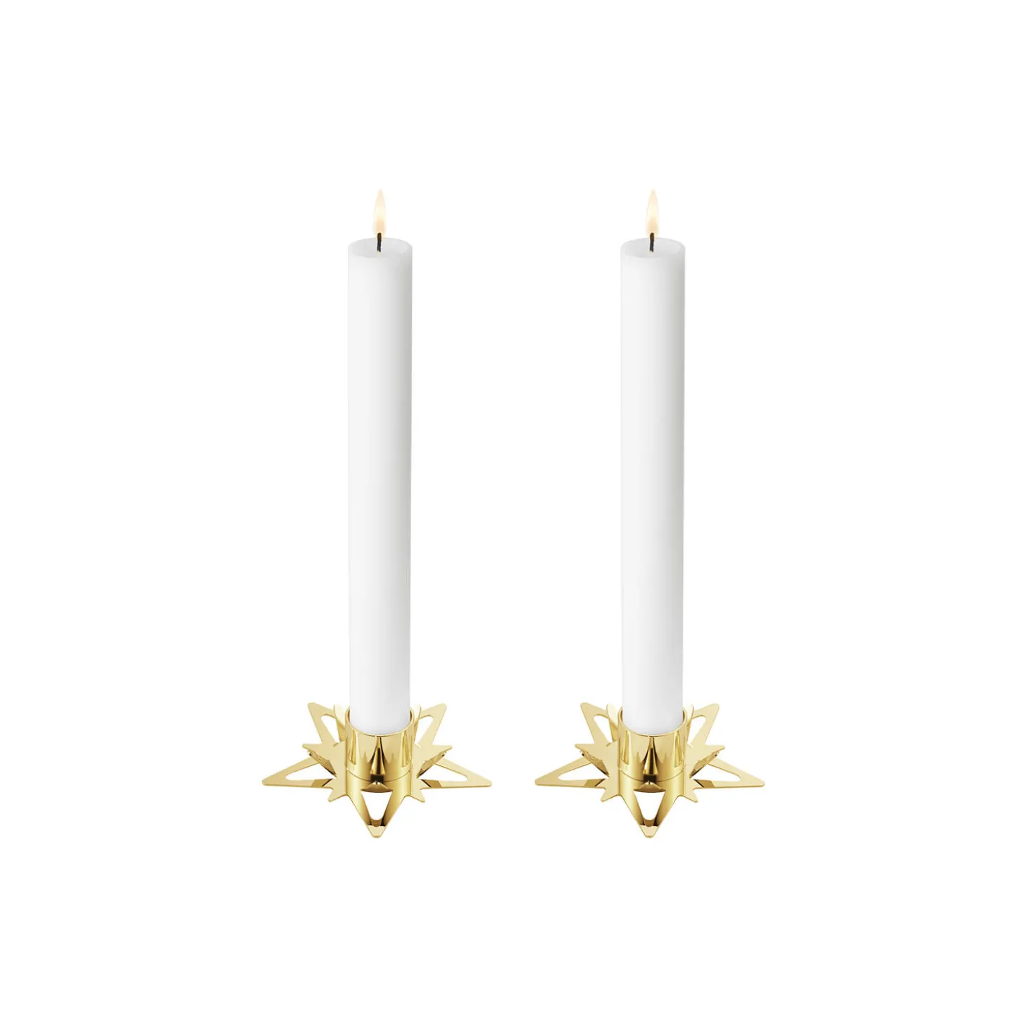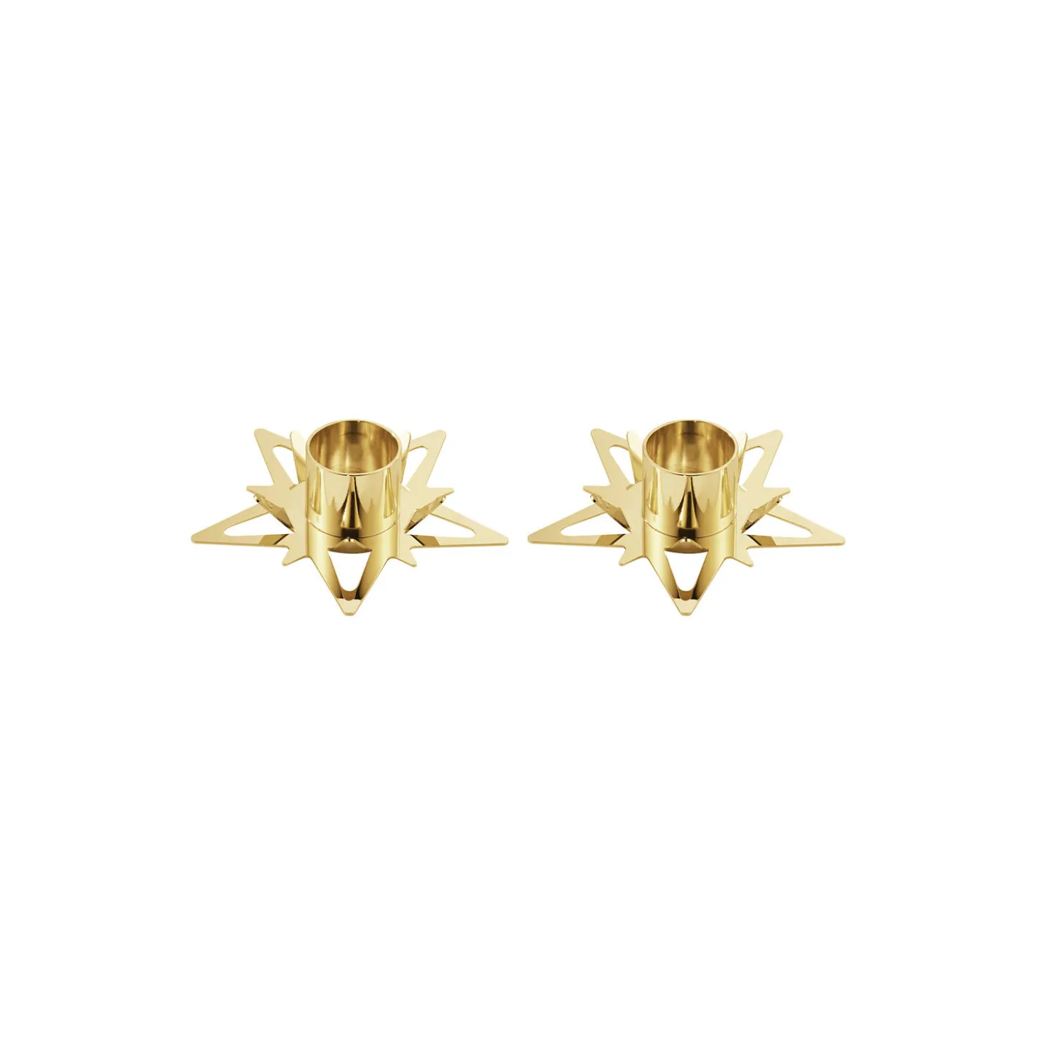 Disse 18 karat guldbelagte lyseholdere kan være en del af julebordet eller pynte på kaminhylden eller i vindueskarmen, og giver juletiden et strejf af moderne skandinavisk stil. De vinklede spidser reflekterer stearinlysets varme glød og udløser flimrende stjerneskud af magi i hele rummet.