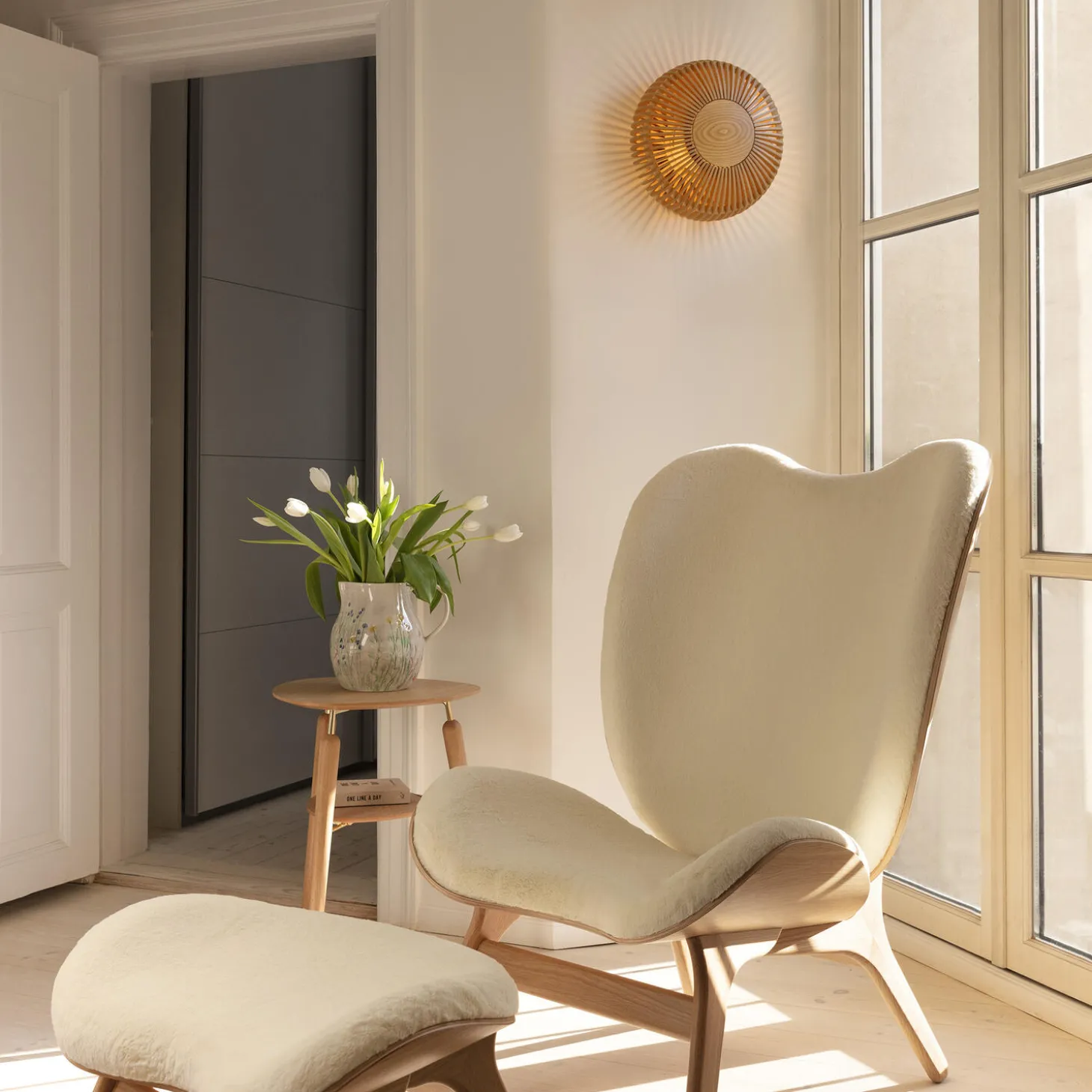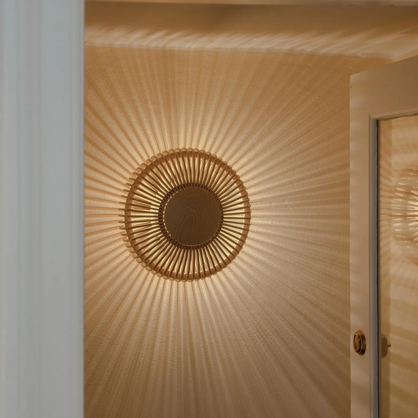 Clava Up wood is a wall lamp made from laser-cut wood lamellae, designed to illuminate the home with playful rays of light on the walls in the surrounding space. Clava Up wood is available in oak, dark oak and black oak in two different sizes. The wall lamp will become the perfect add-on to a beautiful gallery wall or hanging side by side in a long hallway.