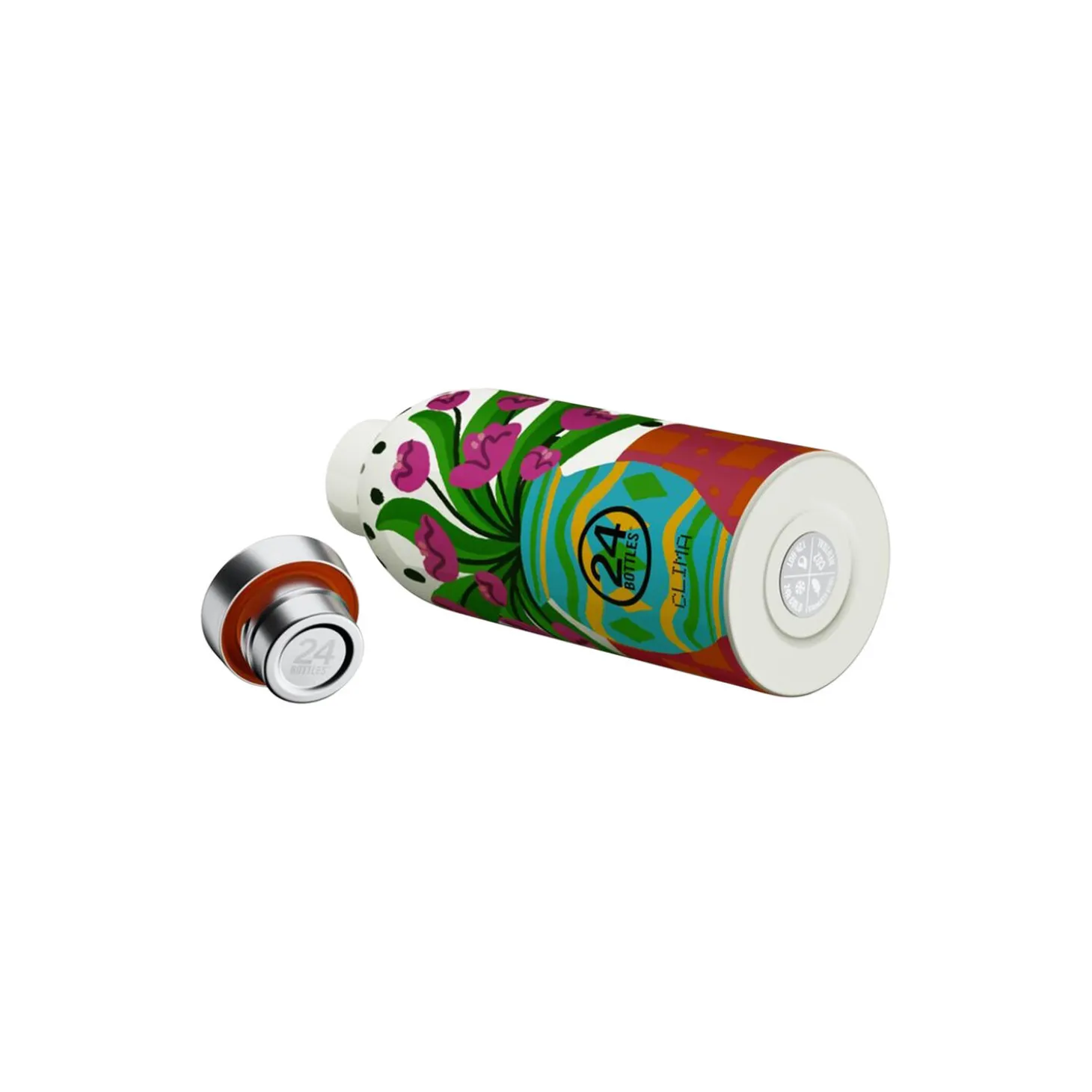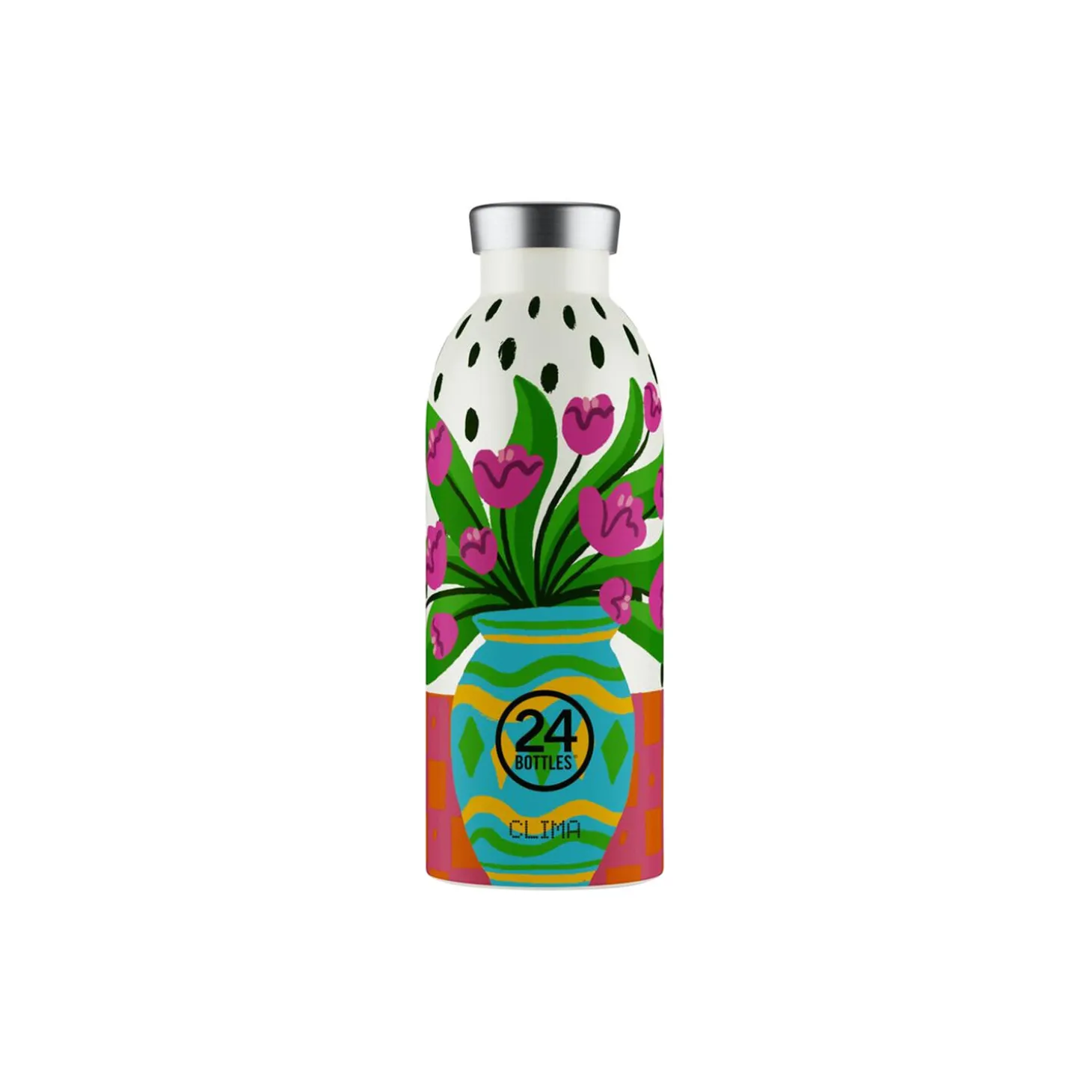 Clima termoflaske i rustfrit stål fra 24Bottles. Farve: fiori rosa. Mål: H: 20,4 x Ø 7,3 cm. Indeholder: 500 ml.