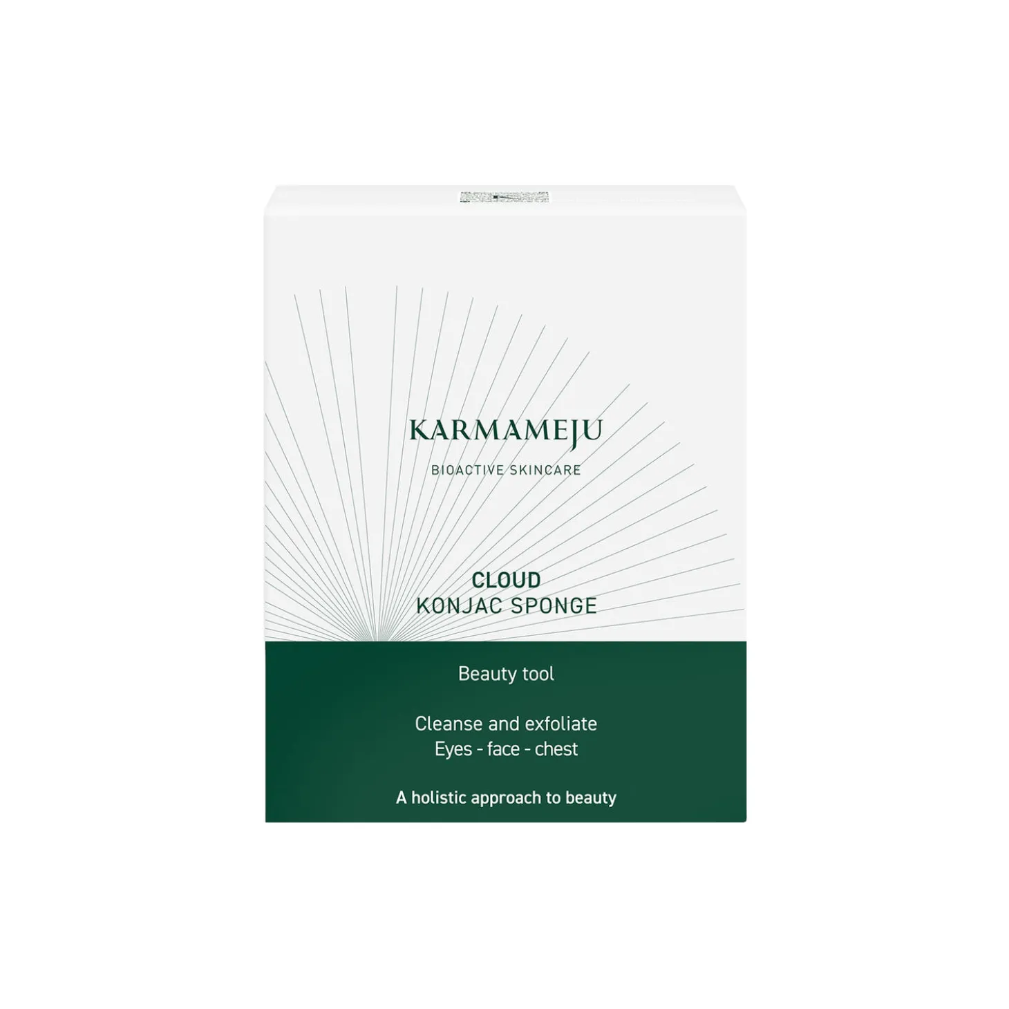 Cloud Konjac Sponge 02 fra Karmameju. Den 100% naturlige konjacsvamp er fremstillet af rå fibre fra Amorphophallus konjac-plantens rod, der eksfolierer og renser huden effektivt, stimulerer blodomløbet og hudens genopbygning uden at skade de sarte lag i overhuden.