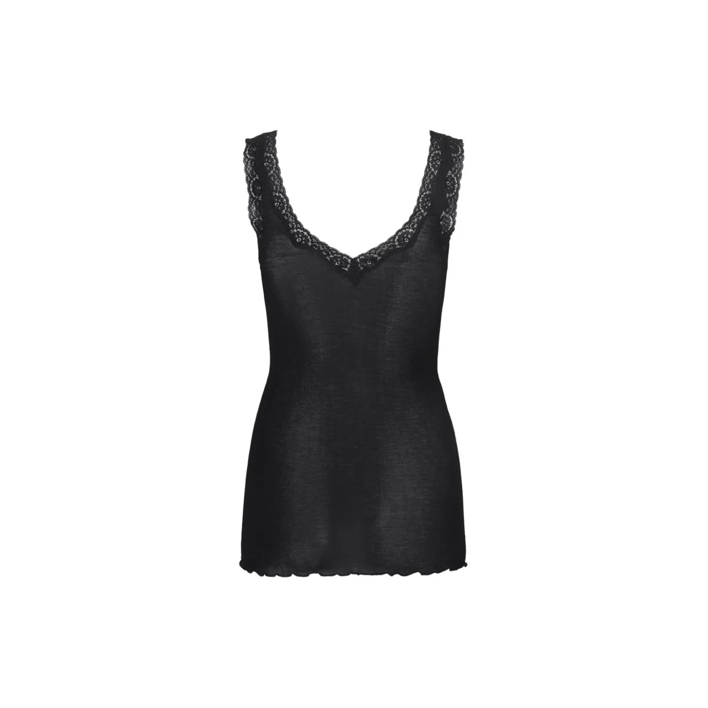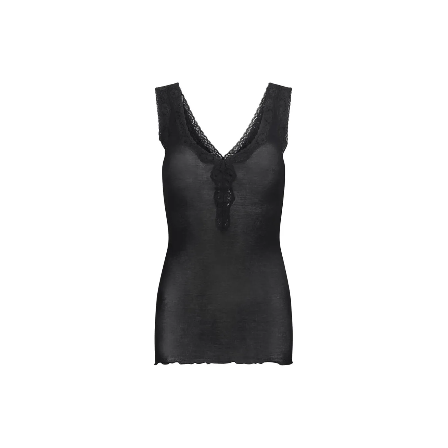 Tank top med dyp V-hals for og bag. Blondekant i halsudskæring og ærmegab. Toppen har overlockede kanter i bunden. Produceret i let og blød bomuld.