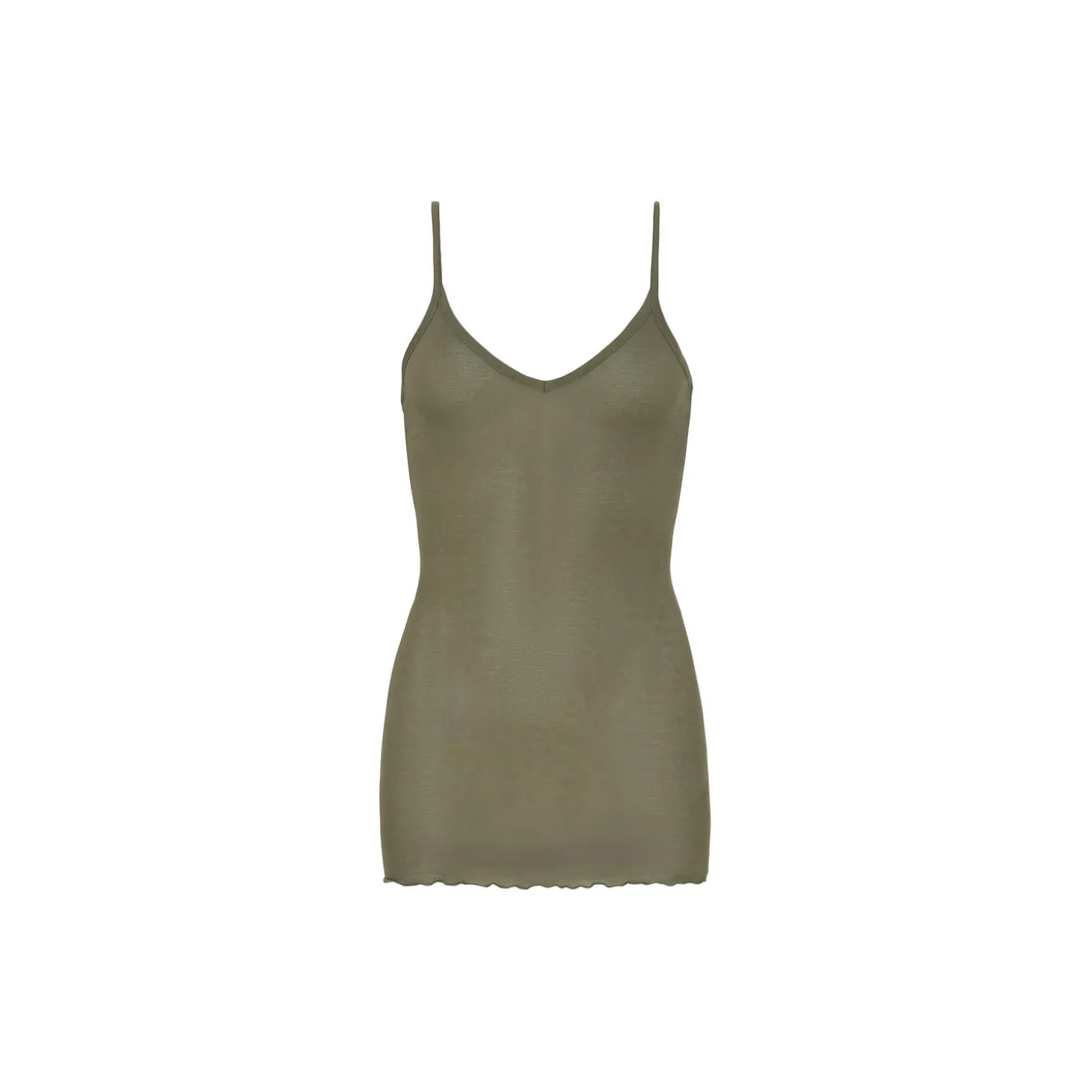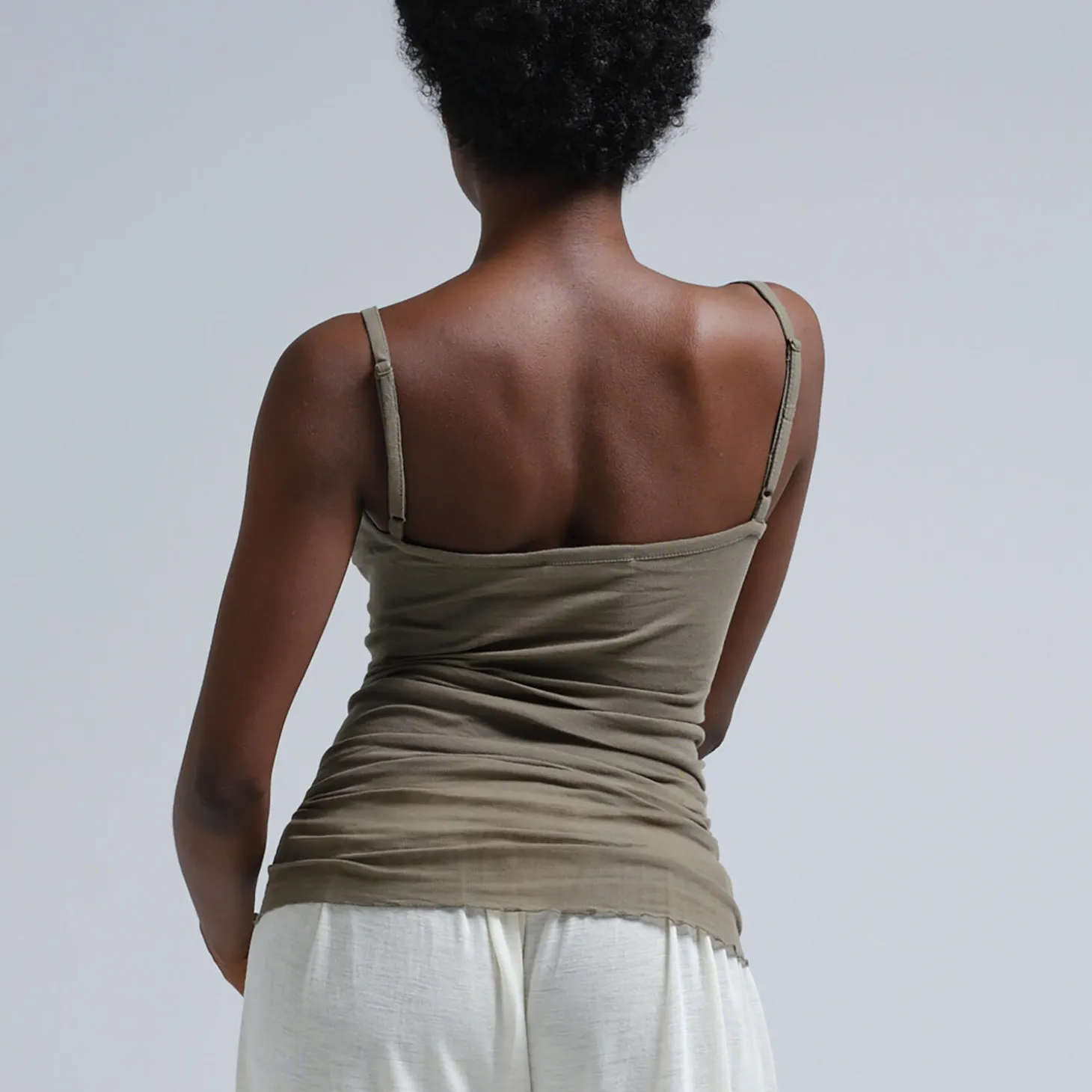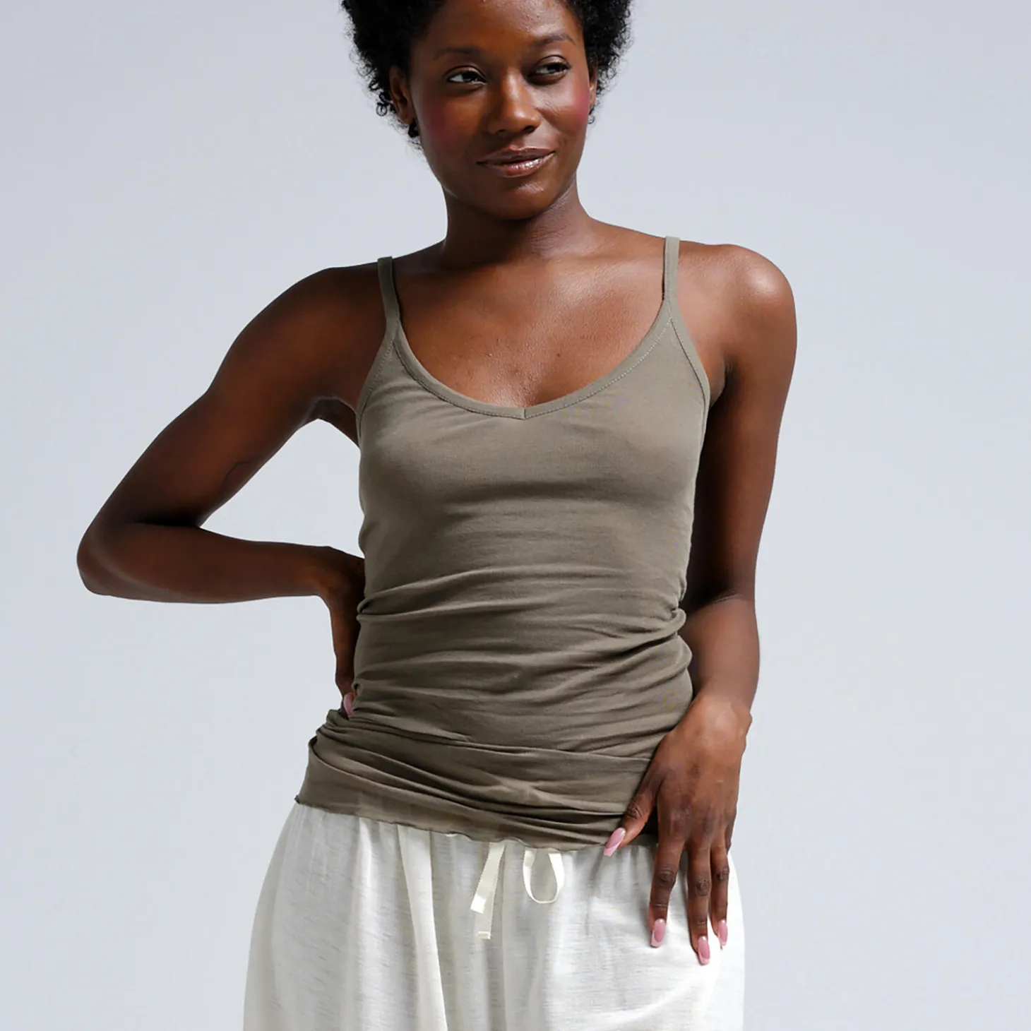 Cami top med dyp V-hals foran og lige overskæring bagpå. Justerbare skulderstropper. Toppen har overlockede kanter i bunden. Produceret i let og blød bomuld.
