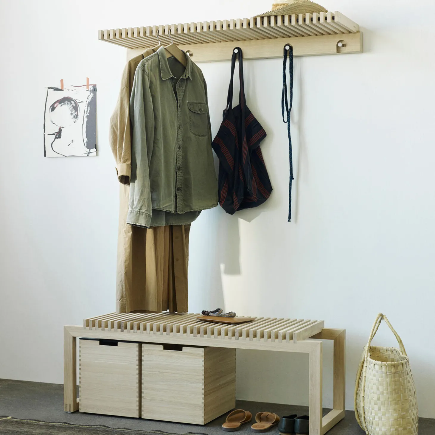 Cutter serien af den danske designer Niels Hvass er minimalistisk, funktionelt design, der er ideelt til entréen. Kollektionen består af en række karakteristiske møbler, der kombinerer skønhed med praktiske løsninger på hverdagens behov. Hver eneste detalje har en funktion på den stilrene Cutter garderobe. Brug den som hylde til hatte og æsker, bøjlestativ til blazere og skjorter og knagerække til frakker og jakker – eller det hele på én gang. En perfekt praktisk løsning til mindre rum og smalle entréer.