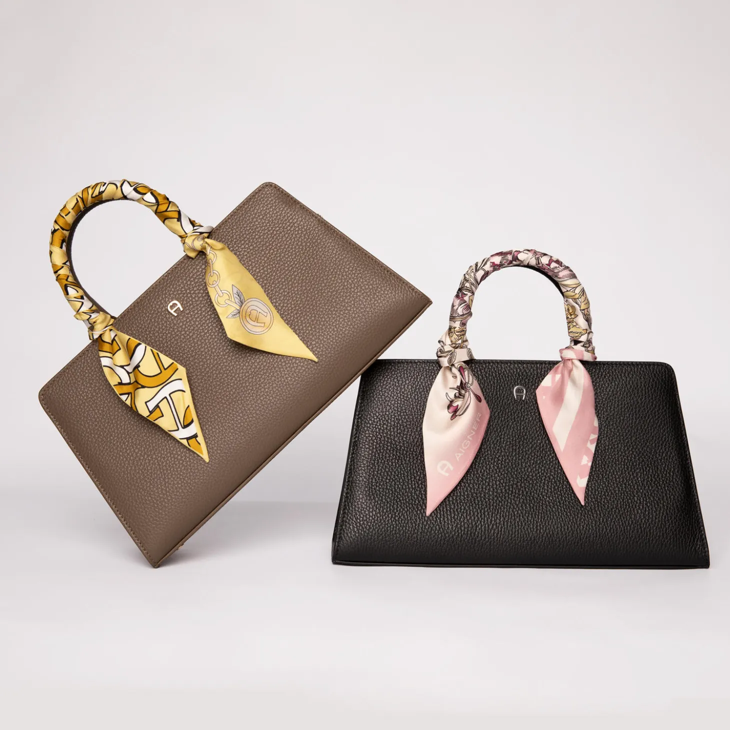 En tidløs klassiker nyfortolket. Cybill håndtaske størrelse M fra AIGNER i en ny, strakt form. Lavet af højkvalitets okselæder, fremstillet i Italien, denne taske er et absolut højdepunkt i kollektionen. Den lyse guldfarvede eller sølvfarvede metaldele runder det smarte design af. Tasken er alsidig på grund af den justerbare skulderrem. Oplev din nye yndlingstaske til dig selv.