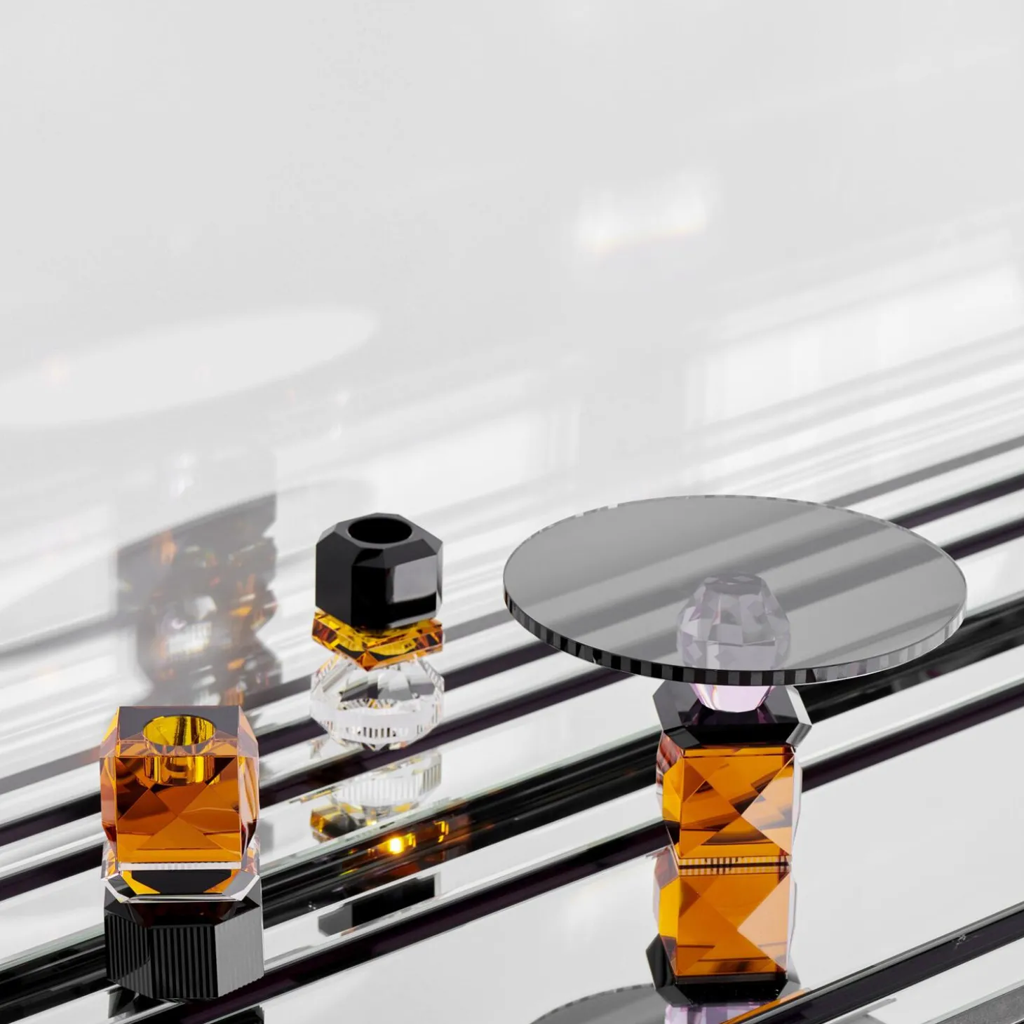 Kantede, klare og skarpskårede former forenes i denne fantastiske krystalkombination. De ravfarvede, sorte og klare krystaller repræsenterer et legende og moderne look. Skabt ud af fine, håndskårede krystaller og kunstnerisk designet til at lade lys bryde gennem de facetterede silhuetter. Tilføj Dakota Fyrfadsstagen til din borddækning for en funklende fornemmelse.