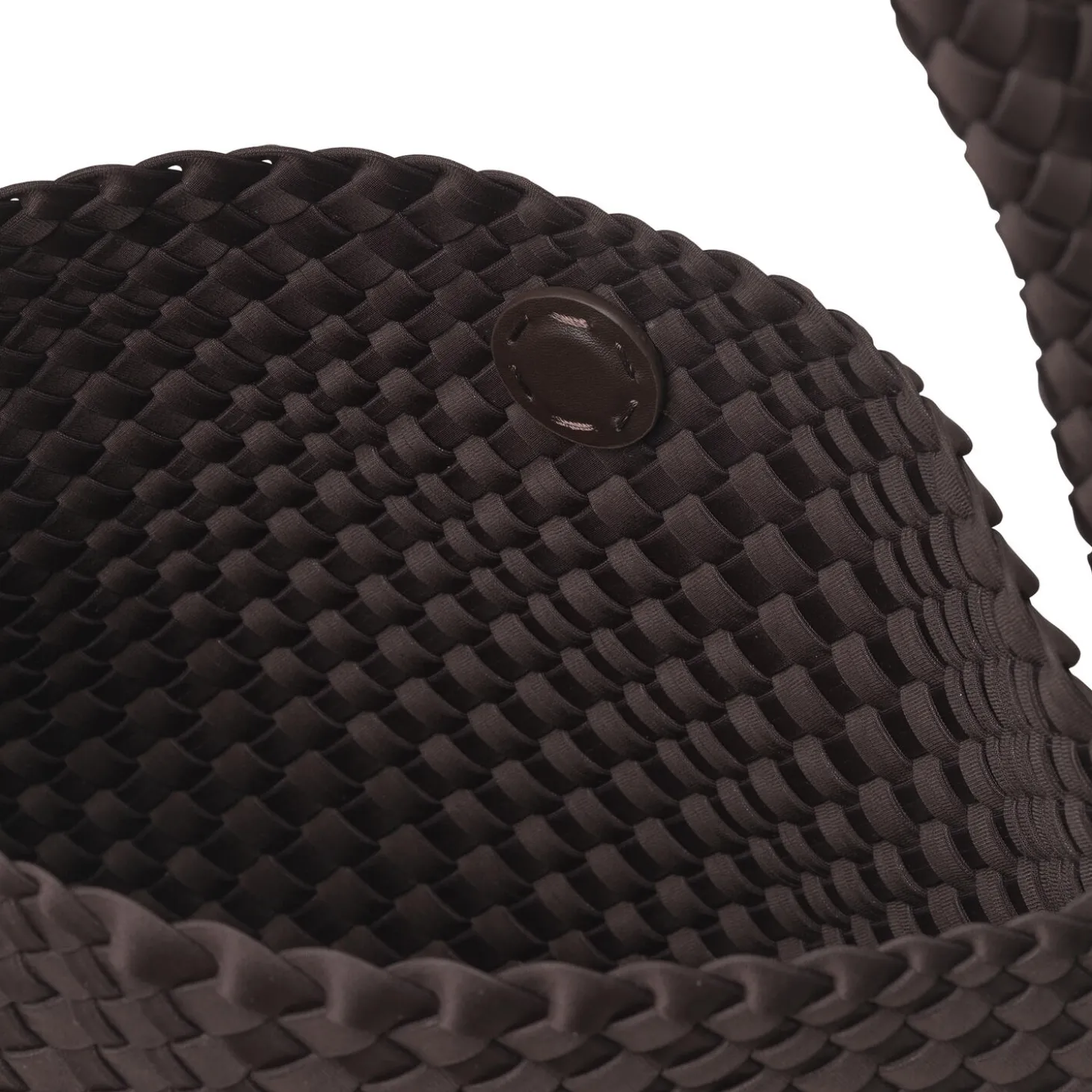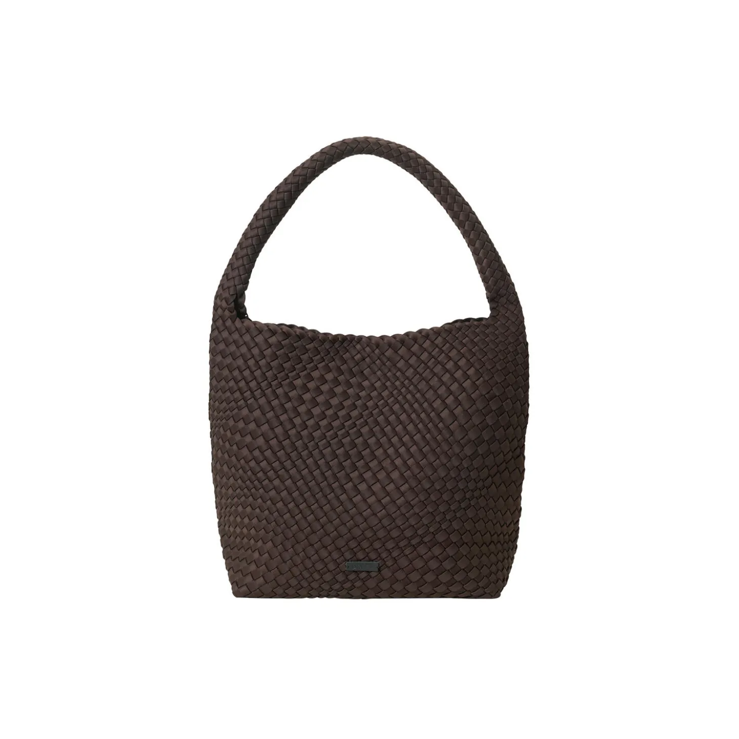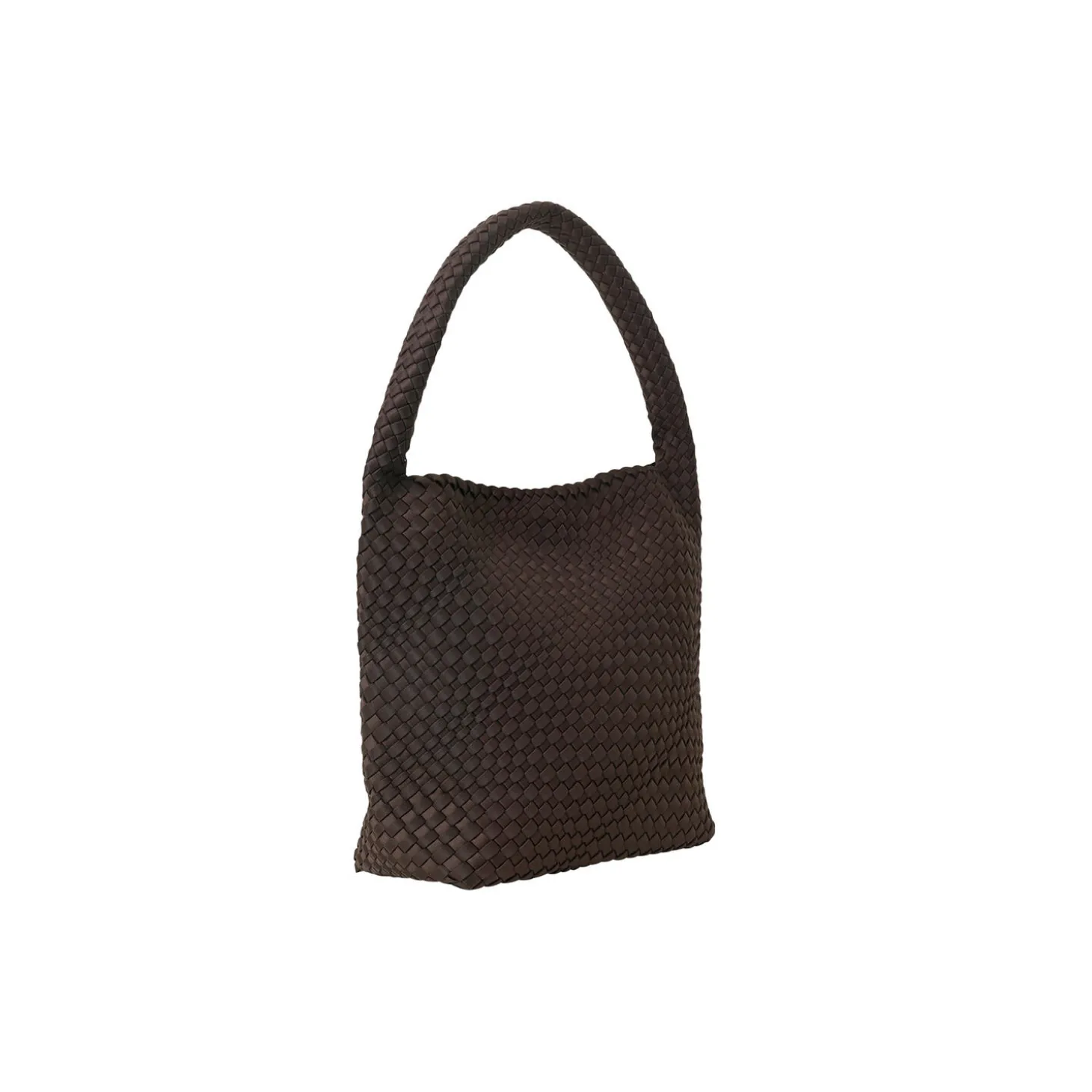 Denne rummelige skuldertaske er håndflettet i ét stykke i et opgraderet neoprenmateriale, der kombinerer blød komfort med et struktureret udtryk. Tasken lukkes med en magnetisk knap og har en forstærket bund, som giver god formstabilitet.