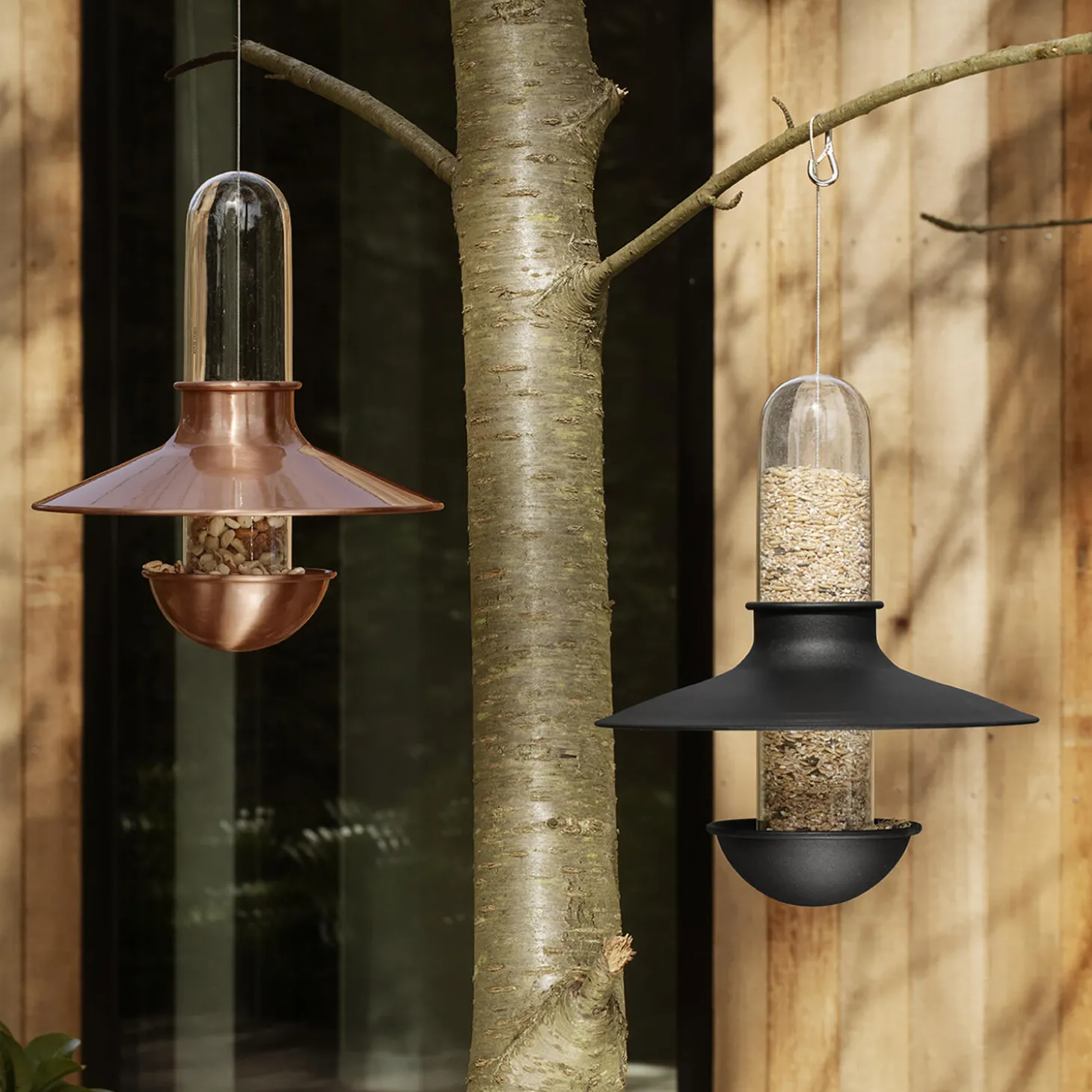 Forkæl de fugle, som bliver på vores breddegrader over vinteren. Hæng en funktionel foderautomat op i haven og nyd besøget af småfugle, der ubesværet kan lande på automatens stålkant. Det store tag sikrer, at store fugle ikke kan komme til. Foderautomaten er nem at påfylde. Vær opmærksom på, at kobberet naturligt vil oxidere og få en smuk patina med tiden. Ønsker du at beholde det blanke look, kan foderautomaten pudses med almindeligt kobberpudsemiddel. Nem at rengøre. Glas tåler maskinopvask, kobberet skal rengøres i hånden.