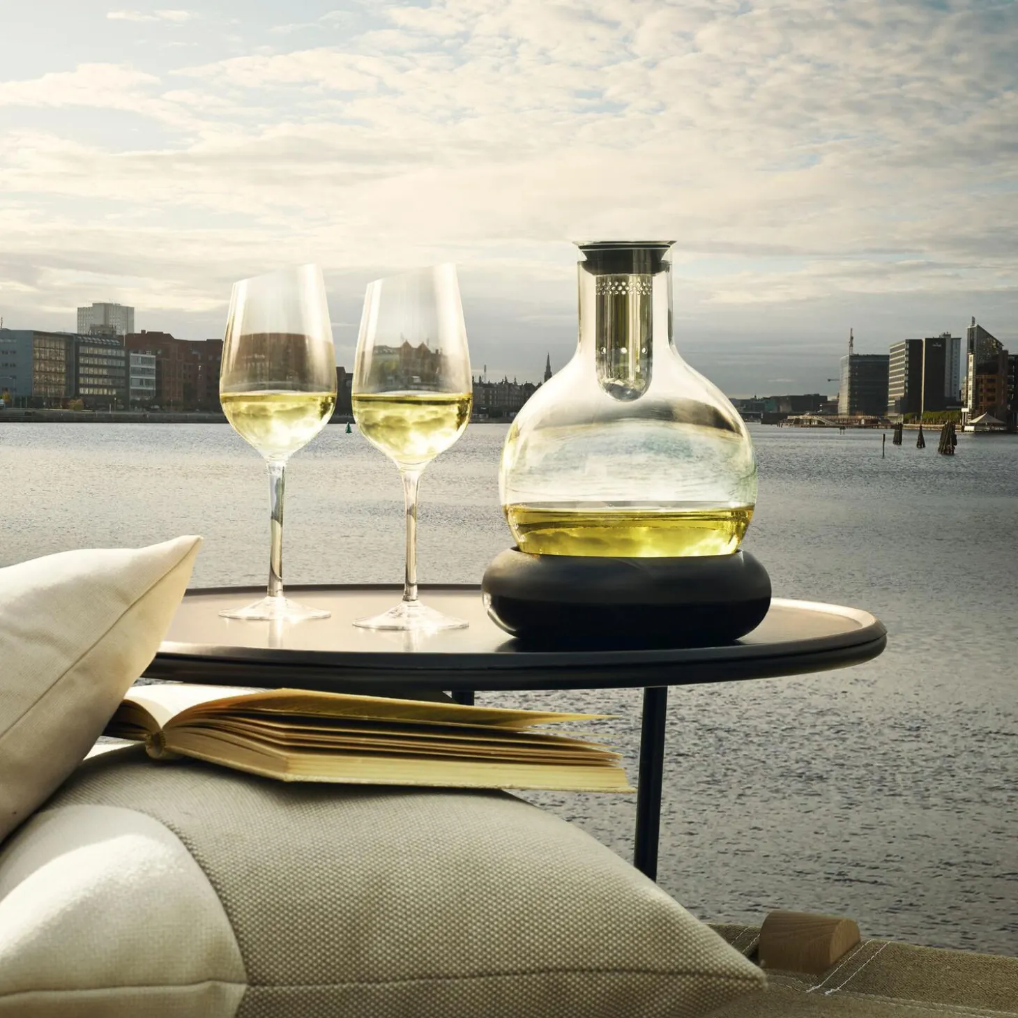 Mange ved ikke, at man sagtens kan dekantere f.eks. en hvidvin, og at mange hvidvine ofte har godt af, at blive iltet igennem for at åbne op for alle smagsnuancer. ”Hvidvin kan dekanteres, og især en fedmefuld Chardonnay har godt af det”, udtaler sommerlier Christian Aarø. Og den nye Eva Solo dekanteringskaraffel dekanterer din vin skånsomt gennem den integrerede tragt, som er perforeret af en masse småbitte huller. Når vinen løber igennem de mange små huller og fortsætter ned langs karaflens inderside, iltes den nænsomt og effektivt, og samtidig giver karaflen en stor iltningsoverflade. Basen har et udtageligt køleelement, som lægges i fryseren før brug, og som kan holde vinen dejlig kold i mange timer. Tip: Hav altid køleelementet i fryseren, så det er klar til uventede gæster.