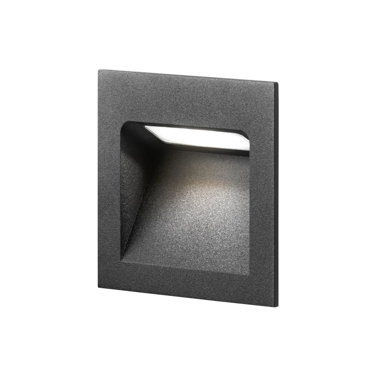DELI 1 væglampe i aluminium fra LIGHT-POINT. Farve: sort. Mål: H: 9 x B: 9 x D: 5,5 cm. Lyskilde: 4,5W LED. IP54. 3000K. Indbygges i væg. Kan tilsluttes lysdæmper og anvendes både indendørs og udendørs. Design: Ronni Gol.
