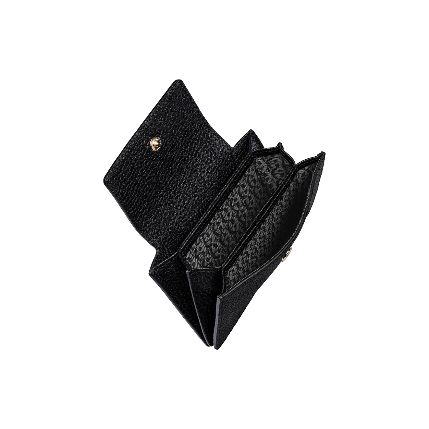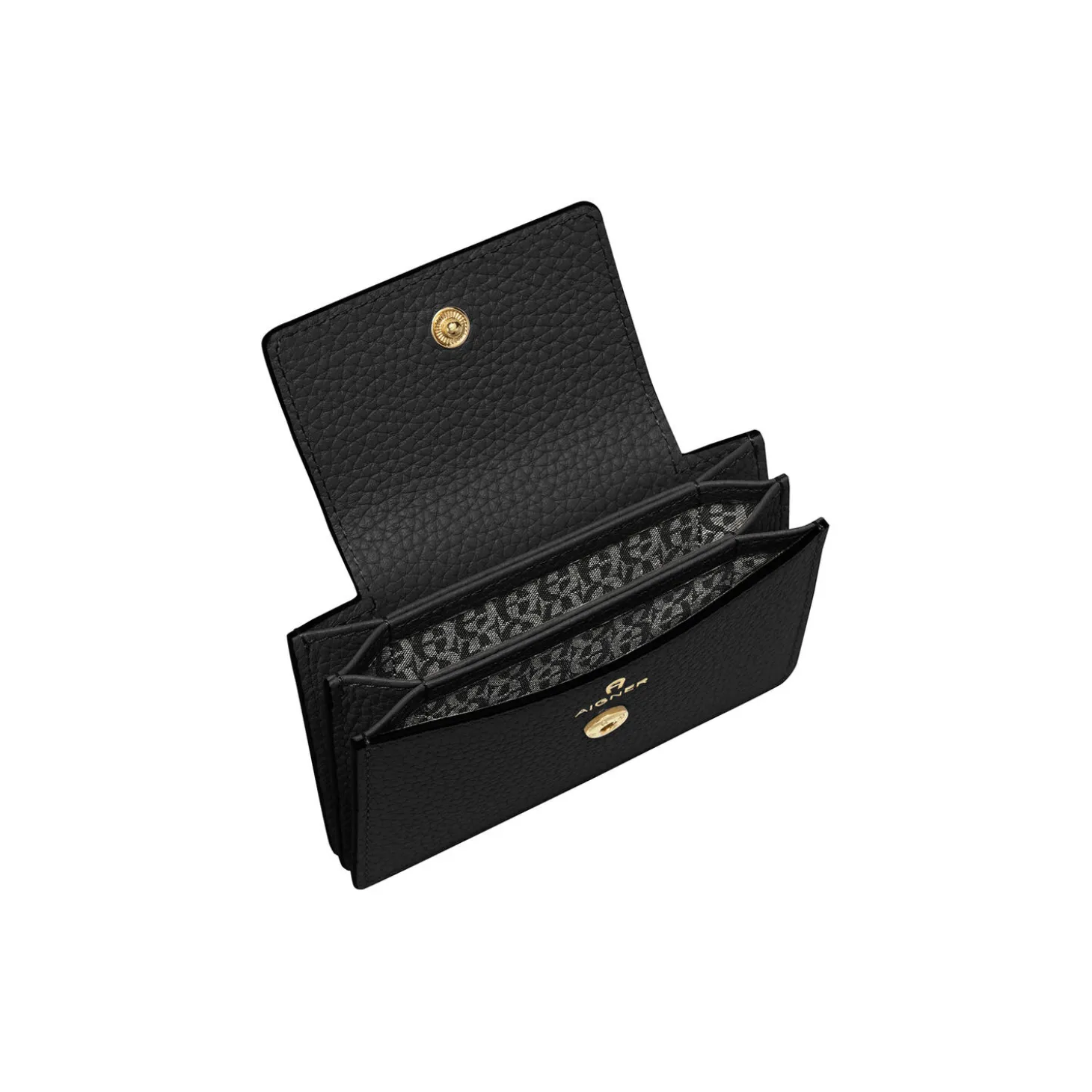 DELIA Card case. 8H x 11.5W x 2D cm. Metal parts: shiny light gold. Closure: press button. Credit cards: 3. Diverse: 2.