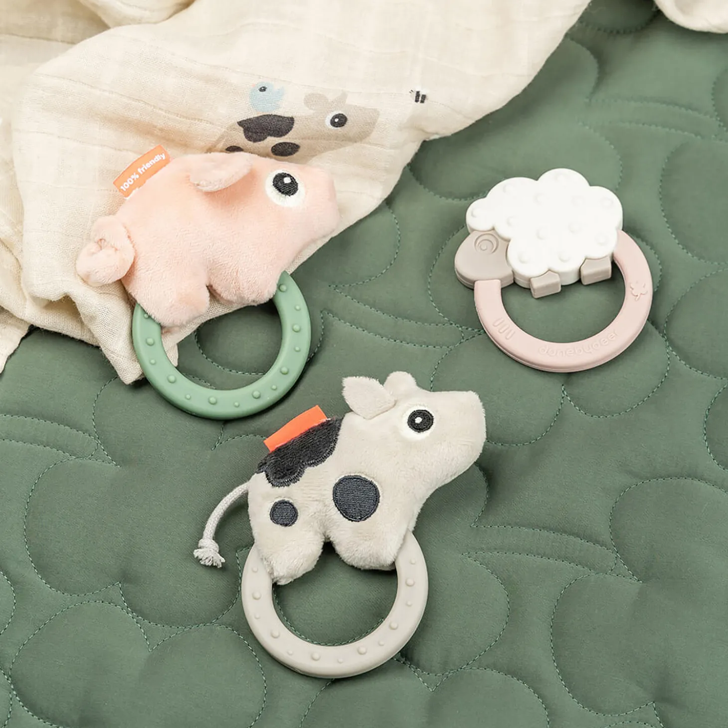 • Sensoriske elementer som en rangle og forskellige teksturer vil stimulere dit barns hørelse og taktile sans• Ringen gør det nemt for de små fingre at holde fast og aktivere lyden• Bideringen er god til at stimulere og berolige kløende tandkød• Dotti i fin sandfarve med kontrastfarver for visuel stimulering