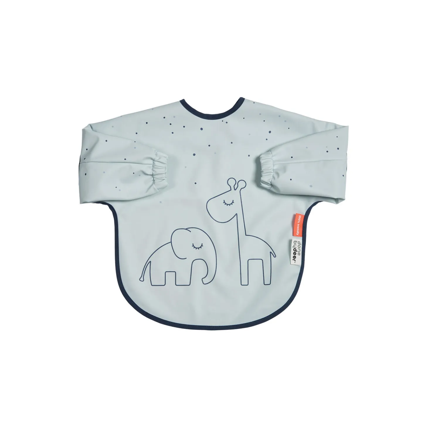 Dreamy Dots hagesmæk med ærmer i 100% polyurethan og polyester fra Done by Deer. OEKO-TEX®-certificeret. Farve: blå. Mål: 35×72 cm. Alder: 6-18 måneder.