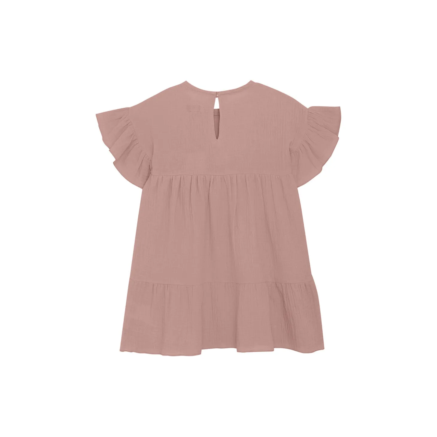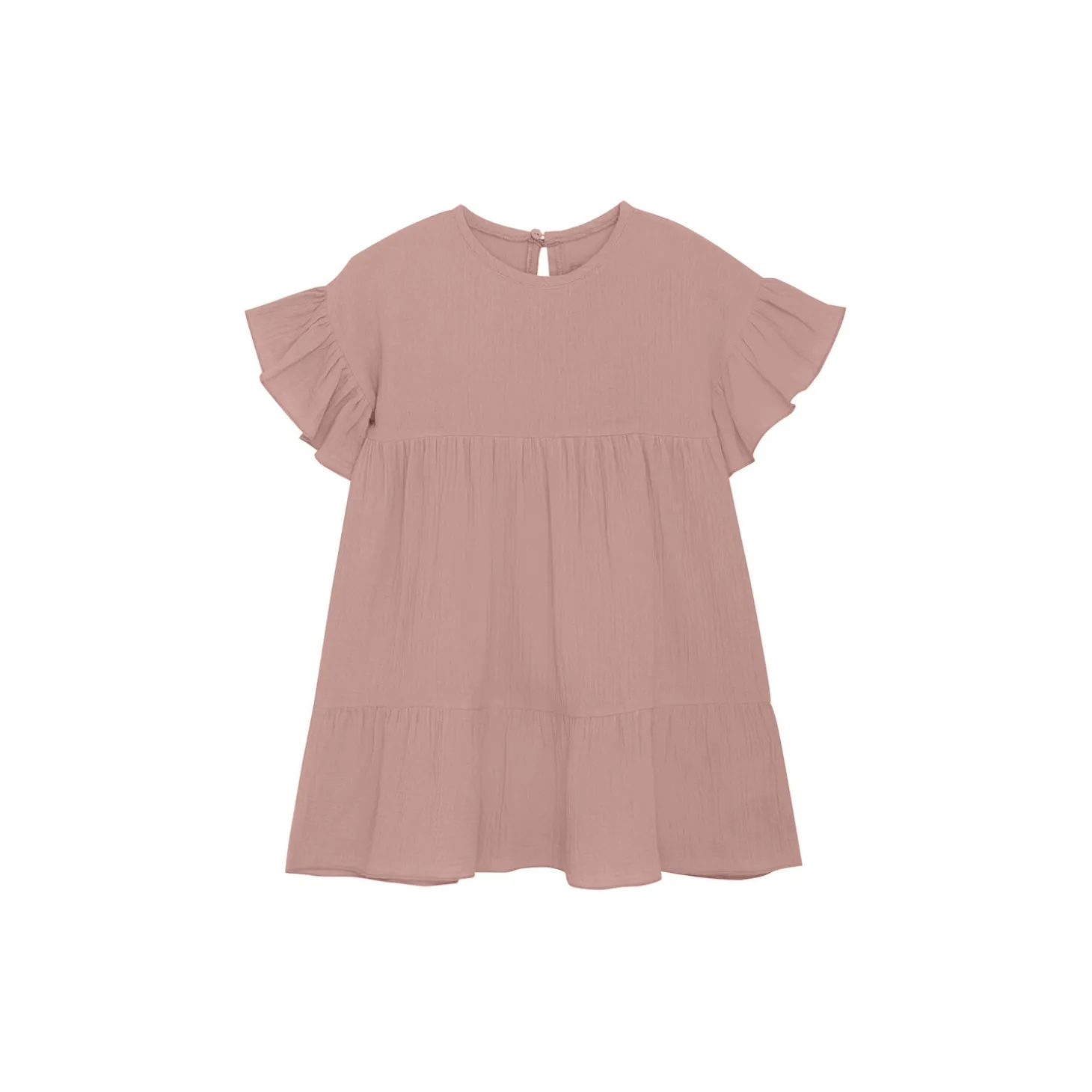 Flot muslin kjole fra HUTTEliHUT. Kjolen er kortærmet og har mange stofansamlinger, som giver en flot piget look. Lukkes med en knap bagpå. Lavet i 100% bomuld, som føles blød og behagelig mod huden. Certificeret i hht. OEKO-TEX® STANDARD 100 Cert. No. 2276-364 DTI