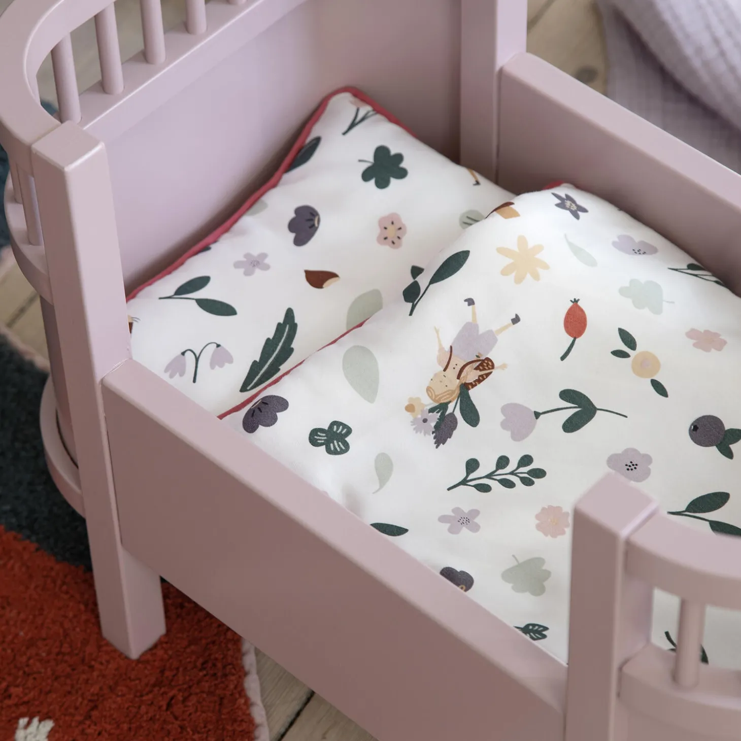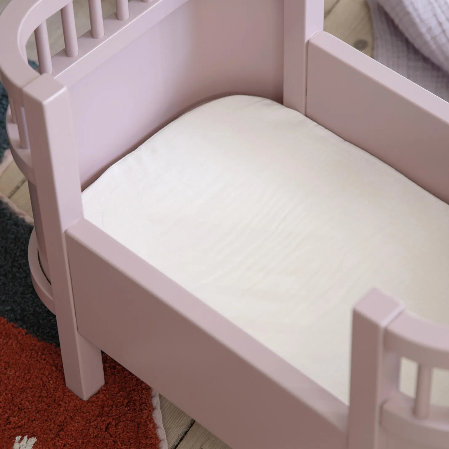 Sebra Dukkesengen – en designklassiker i miniature. Inklusive dukkesengsmadras. Her i farven blossom pink. Dukkesengen er designet ud fra Sebra Sengen, Baby & Jr., den ikoniske baby- og juniorseng, oprindeligt navngivet Juno, designet af Viggo Einfeldt i 1942-43.