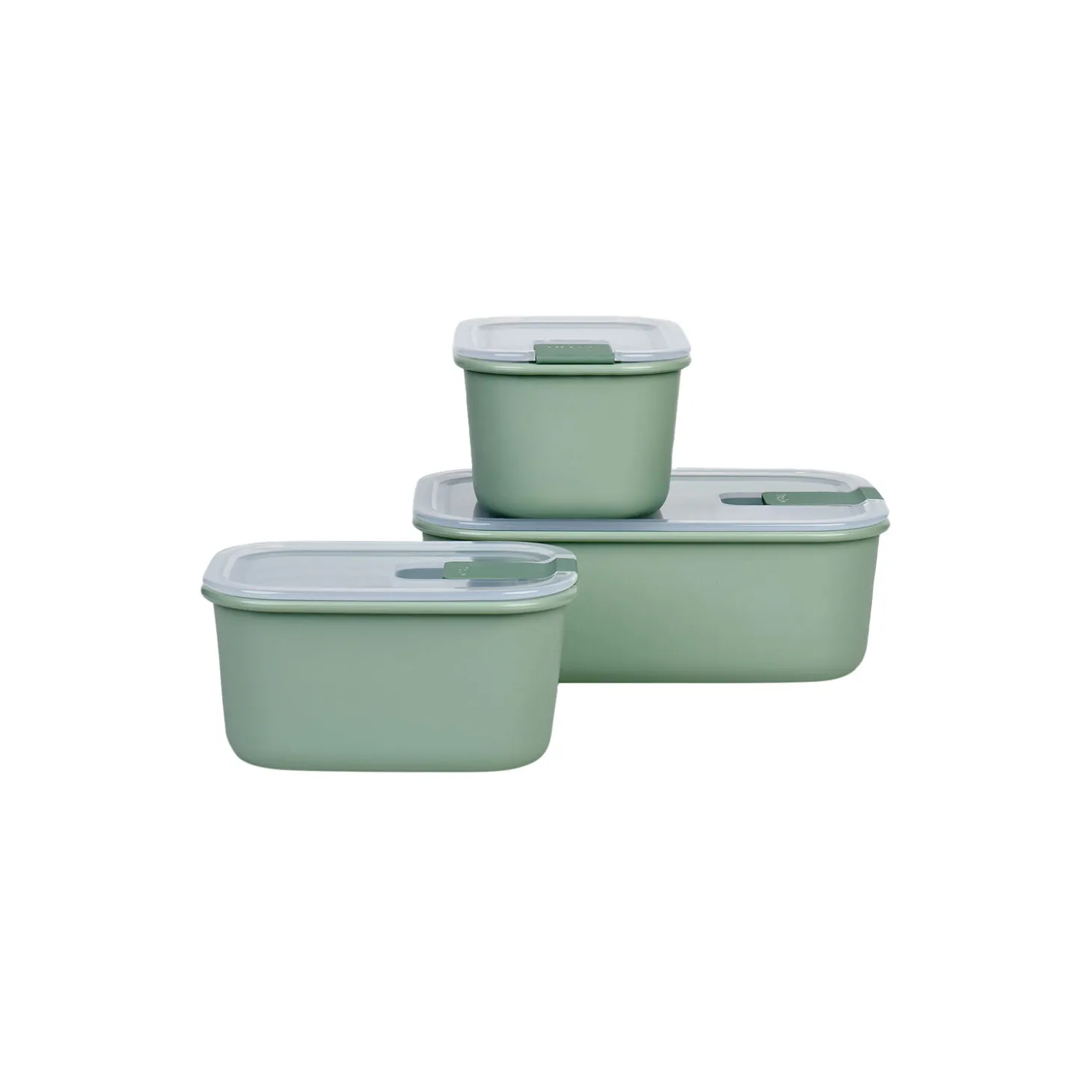 EasyClip er Mepals serie af rektangulære opbevaringsbokse i fem praktiske størrelser med et universelt, gennemsigtigt låg, der kan klipses på og tages af med én hånd, og som passer til både seriens glas- og plastikbokse i samme størrelser. Sæt låget på og luk klipsen. Når du hører klikket, er boksen helt lukket og læk-, luft- og aromatæt. Lågets klips fungerer også som ventil, når boksen bruges i mikroovn. Tætningsringen på låget kan fjernes for nemmere og mere hygiejnisk rengøring. Boksene fås i to forskellige materialer, henholdsvis borosilikatglas og PP-plast. PP-plast er et robust og slagfast materiale, som holder til det meste, og så er det genanvendeligt. Alle seriens bokse er egnede til anvendelse i fryser, mikroovn (PP-bokse: maks. 2 minutter ved maks. 600-750 watt), opvaskemaskine, og boksene af glas tåler desuden ovn op til 500 °C, dog uden låg.Alle bokse, uanset rumfang, har samme højde. Det optimerer opbevaringen og minimerer spildplads, når boksene stables i køleskab og fryser.Dette sæt indeholder 3 bokse i PP-plast bestående af 1 x 1000 ml og 2 x 450 ml i farven Nordic sage.