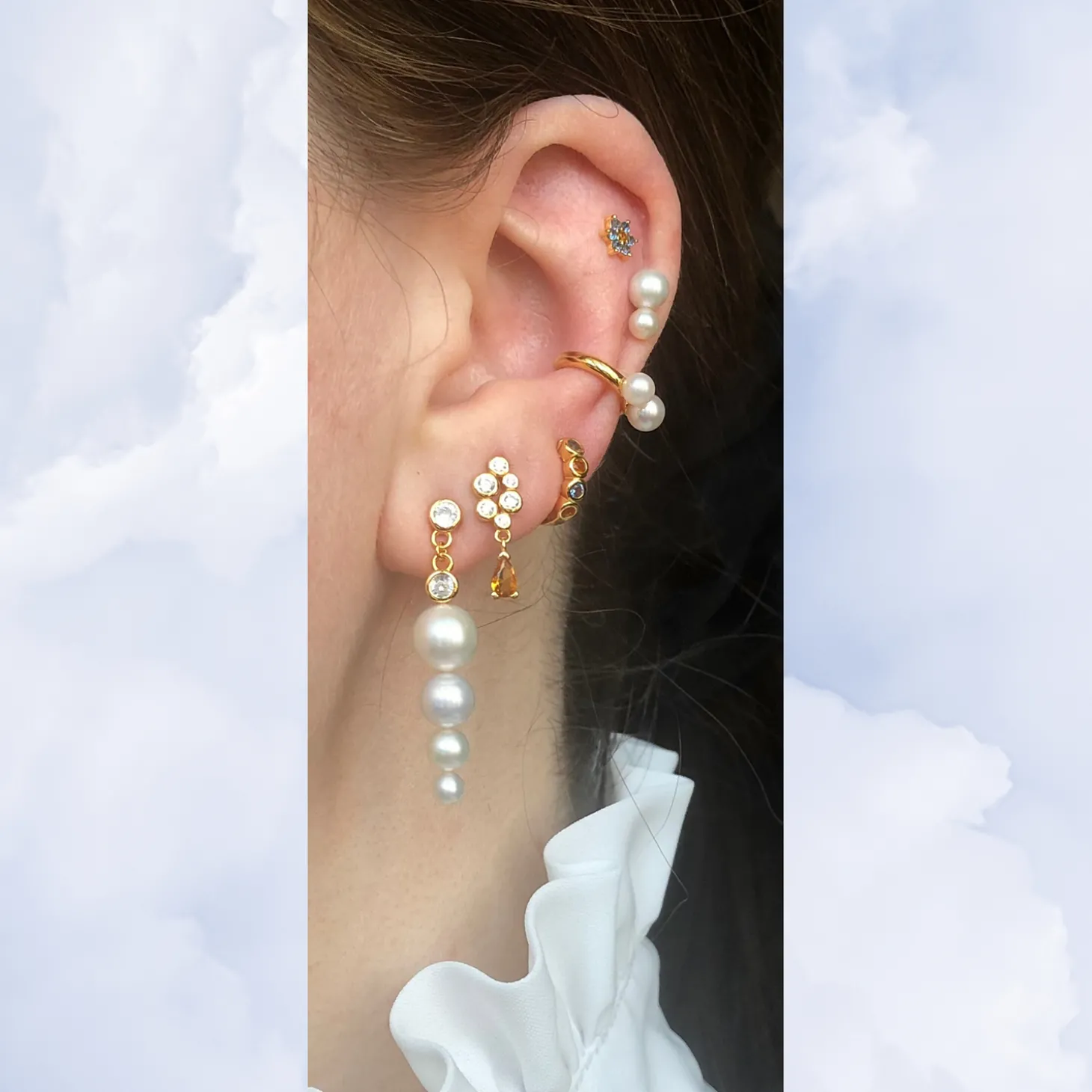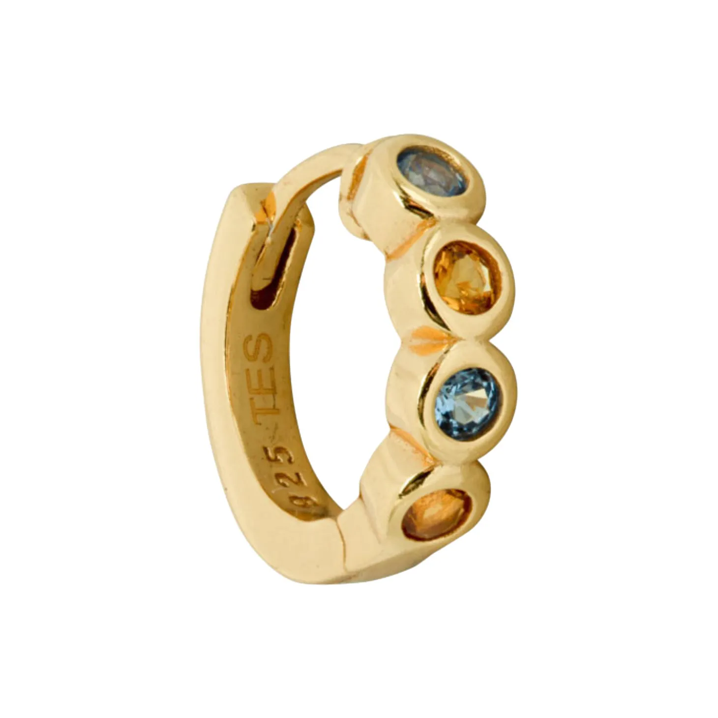 Lille huggie ørering med lyseblå og orange sten. Sælges enkeltvis.