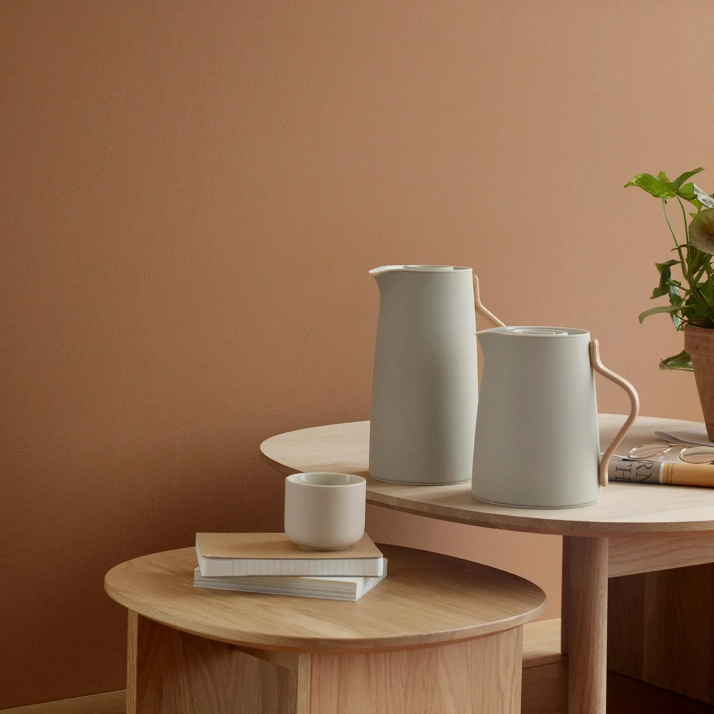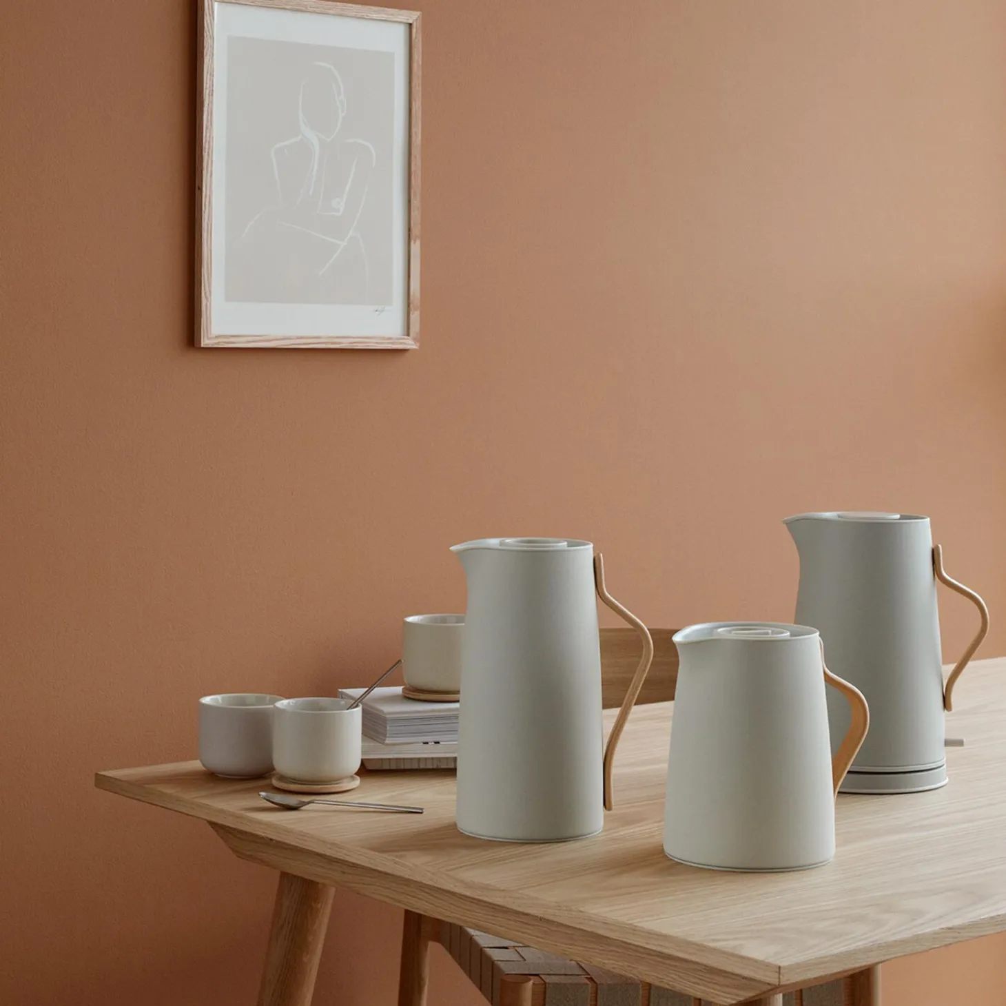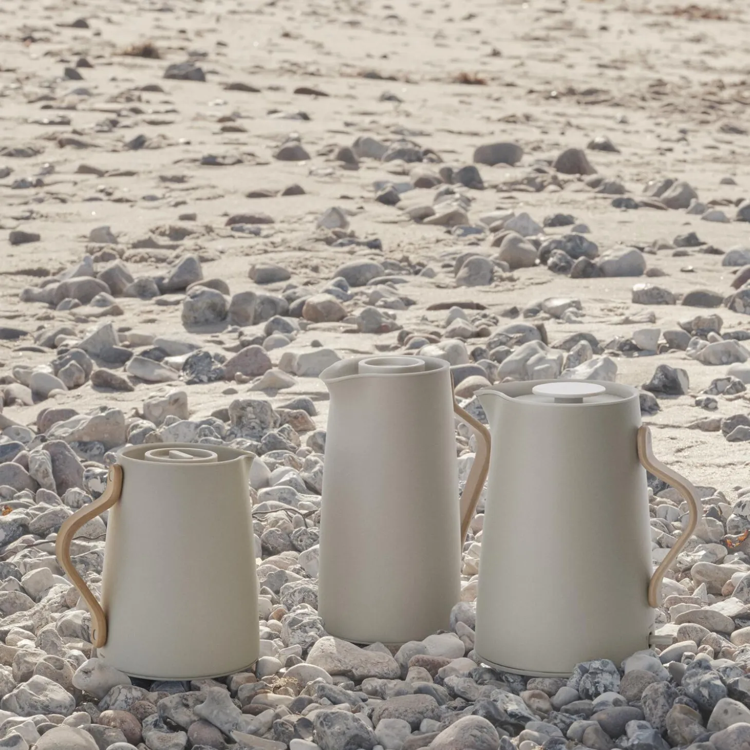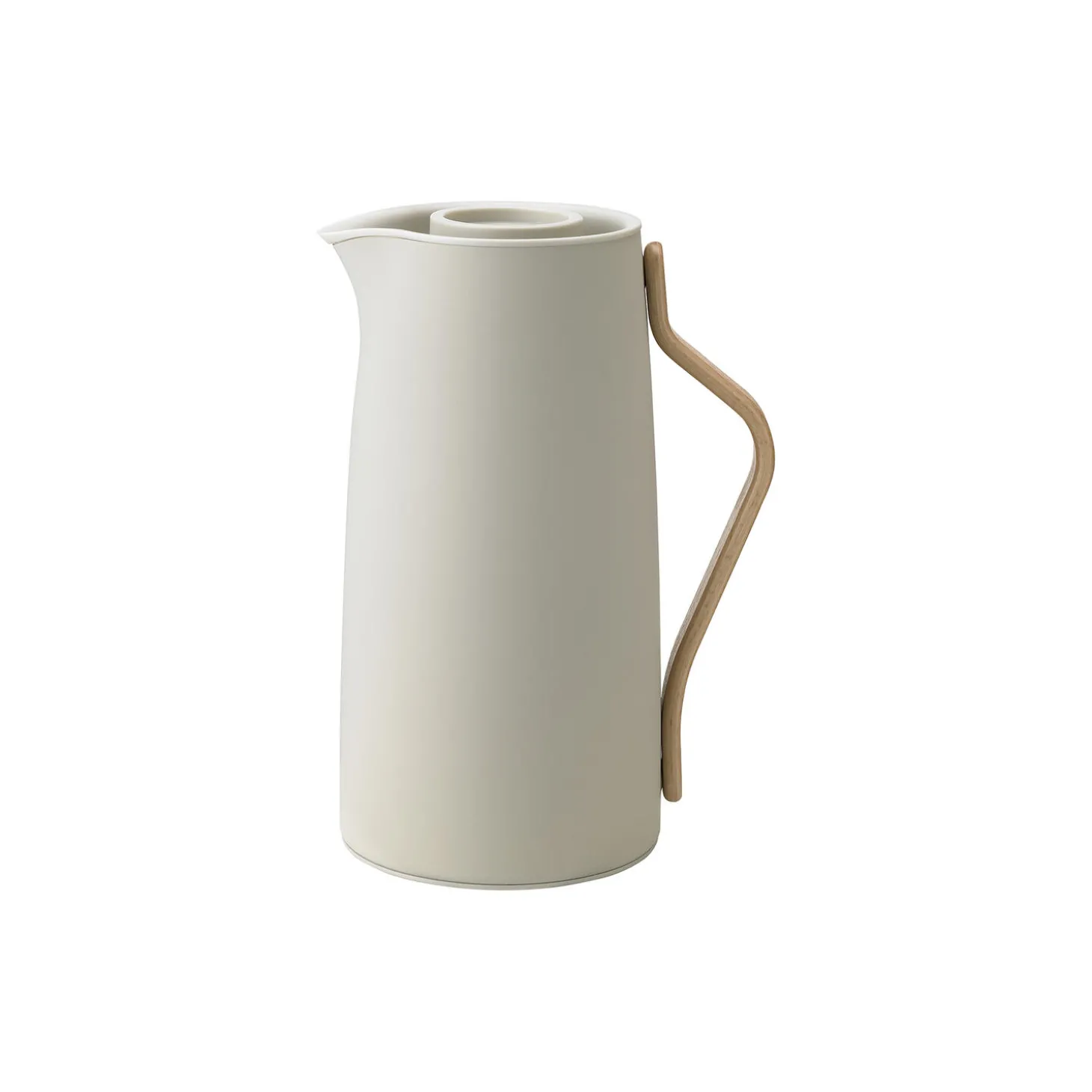 Emma kaffe-termokanden indbyder til brygning af traditionel filterkaffe. Kanden er designet af HolmbäckNordentoft i et moderne, skandinavisk design, der kombinerer lakeret stål i sandfarve med en hank i bøgetræ. Den isolerende stålindsats sørger for at kaffen holder sig varm længe og termokanden indeholder 1,2 l. Med et enkelt klik på låget er kanden åben, hvilket gør at kanden er let at betjene med én hånd. Kaffe-termokanden er både traditionel og innovativ på én gang, og den stoflige sandfarve giver kanden et keramisk udtryk.