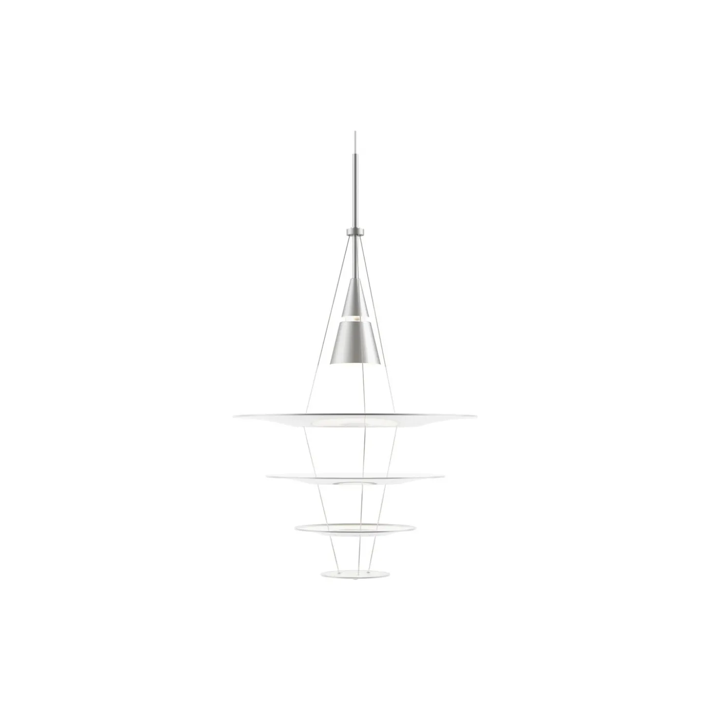 Enigma 425 pendel i akryl med kegle og pendelrør i børstet aluminium fra Louis Poulsen. Farve: aluminium. Mål: H: 74 x Ø 42,2 cm. Lyskilde: 20W GU10. Design: Shoichi Uchiyama.