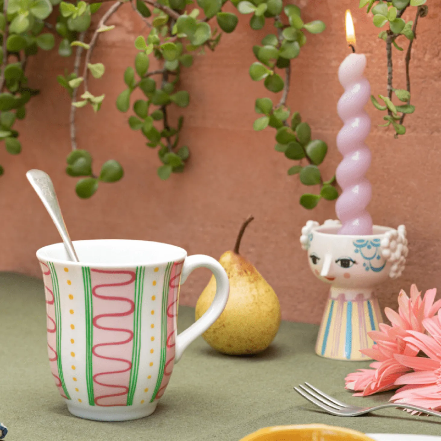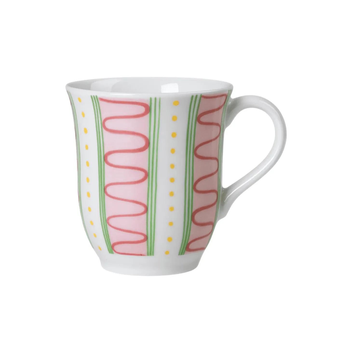 Bjørn Wiinblads univers er alt andet end minimalistisk. Det er overdådigt, skævt, vidunderligt – og i høj grad defineret af livlige farver og en unik stil. Du finder også hans mange finurlige og kunstneriske dekorationer på krus, hvor farverige, geometriske former med et håndtegnet præg blandes på kryds og tværs og alligevel fungerer forrygende sammen. Eva-kruset i rosa har snoede striber i pink hele vejen rundt indrammet af lodrette grønne striber og gule prikker. Mønsteret er inspireret af Eva-vasens forskellige kjoler, og farverne er holdt i de samme delikate nuancer, der kendetegner Evas glade og venlige univers. Kruset rummer 35 cl – perfekt til en god kop kaffe eller te. Det kan roligt vaskes i opvaskemaskinen, når der er sjovere ting i livet end at vaske op i hånden. Hver enkelt krus har sin helt egen personlighed og farvepalette, men har stadig et tydeligt familieskab i kraft af Bjørn Wiinblads genkendelige streg. Eva-kruset pynter og skaber glæde både på bordet og på hylden, hvor det lyser op og gør hverdagen lidt mere farverig – præcis som Bjørn Wiinblad elskede det.