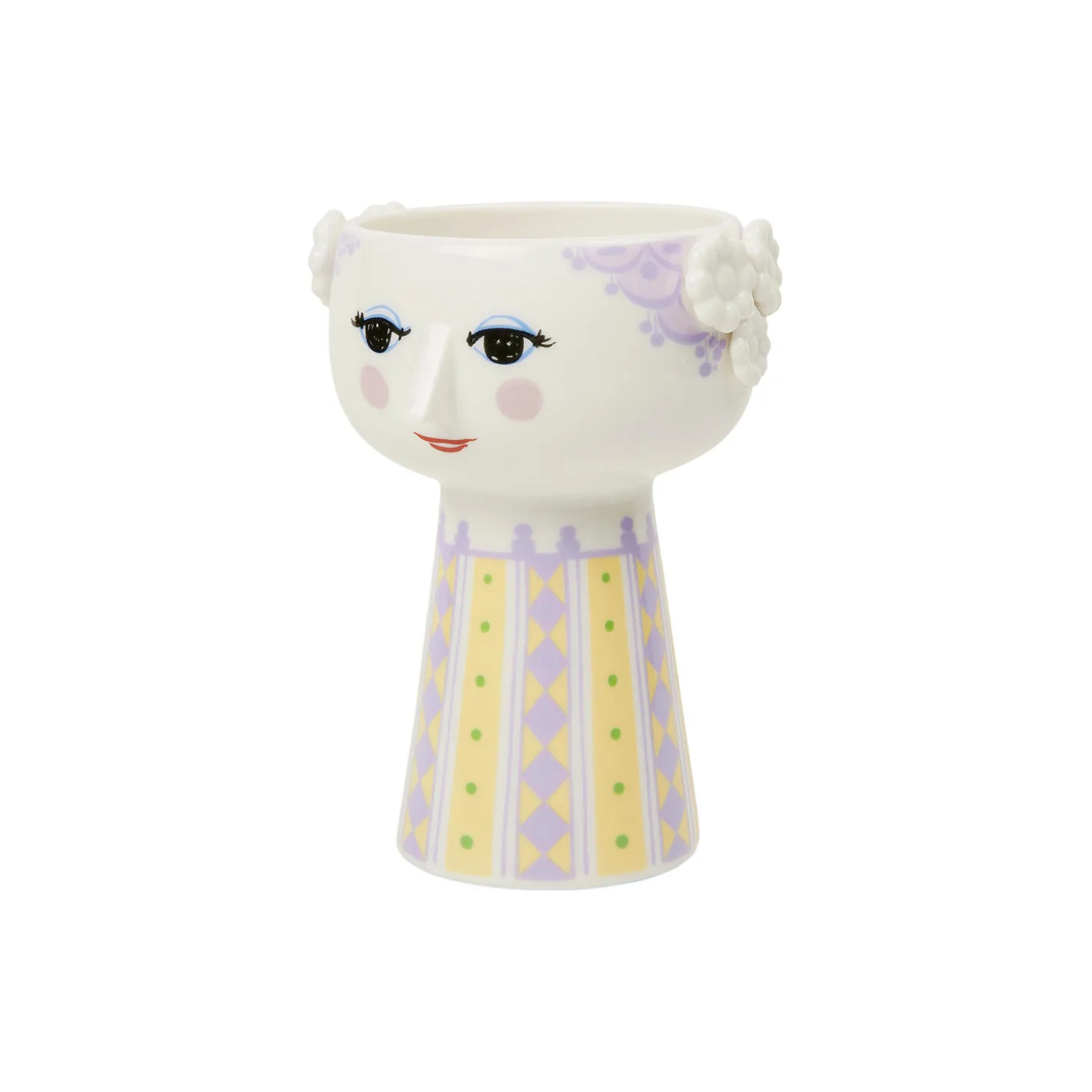 Bjørn Wiinblad repræsenterer alt, hvad der er skørt, skævt, kreativt og vidunderligt. Og med den smukke og smilende Eva-vase fra Bjørn Wiinblad med hår og en farverig kjole i lavendel med gule og grønne nuancer skaber du finurlighed i fuldt flor overalt i hjemmet. Vasen er 15 cm høj med en diameter på 10 cm og er lavet af blankglaseret porcelæn. Ansigtet med de mandelformede øjne og den spidse næse er Wiinblads oprindelige streg, mens det farverige kjolemønster er en nyfortolkning af Bjørn Wiinblads illustrationer fra arkiverne. Formen er inspireret af Wiinblads originale og ikoniske Eva-vaser, der havde brede hoveder og kegleformede kroppe. Bjørn Wiinblad var en livsglad kunstner med en stor og farverig personlighed, der gik sine egne veje og ikke var bange for at drømme og tænke stort. Den sjæl mærkes også i Eva, der hviler i sig selv og inviterer os til at udtrykke vores egen stil og personlighed i indretningen med farverige blomsterbuketter, eksotiske planter, lys og kreative dekorationer. En ting er sikkert: Det bliver ikke kedeligt, når Eva flytter ind.