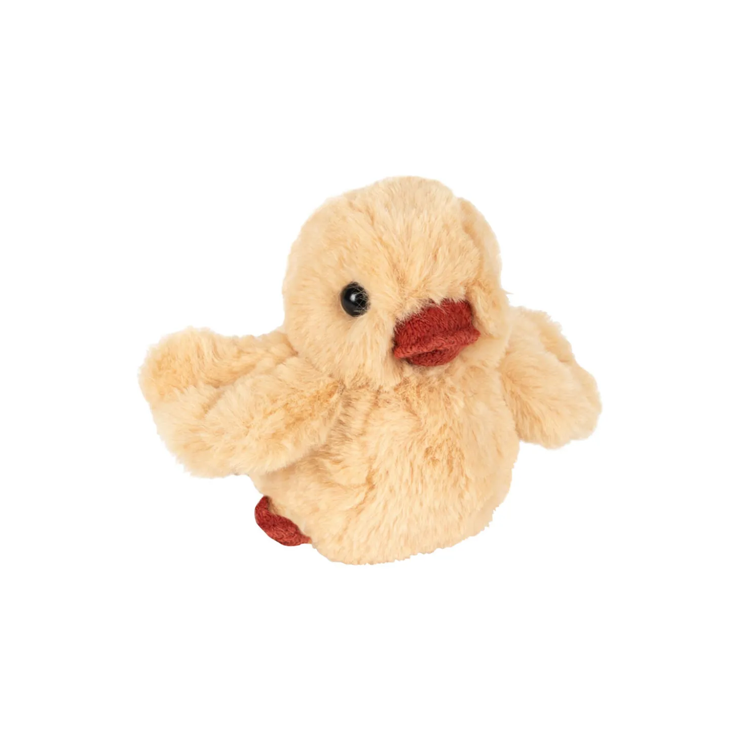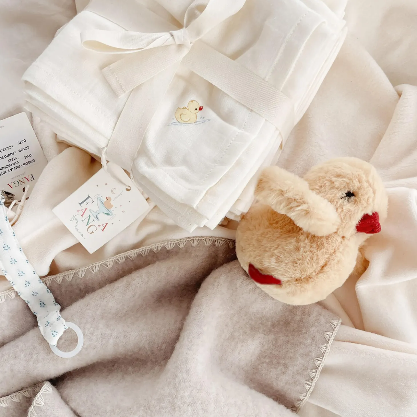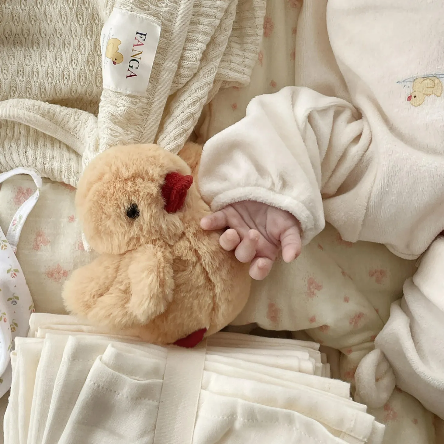 Meet Fanga: Our soft and fluffy little yellow duck that makes a comforting rattling sound when played with.