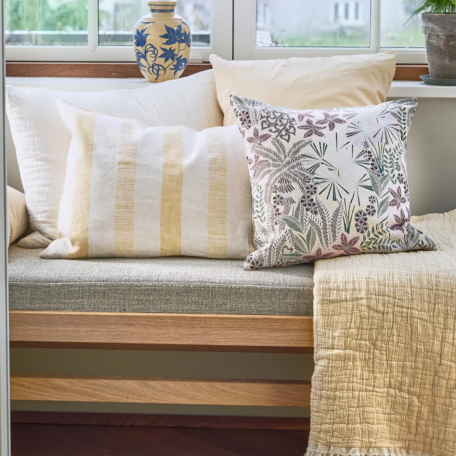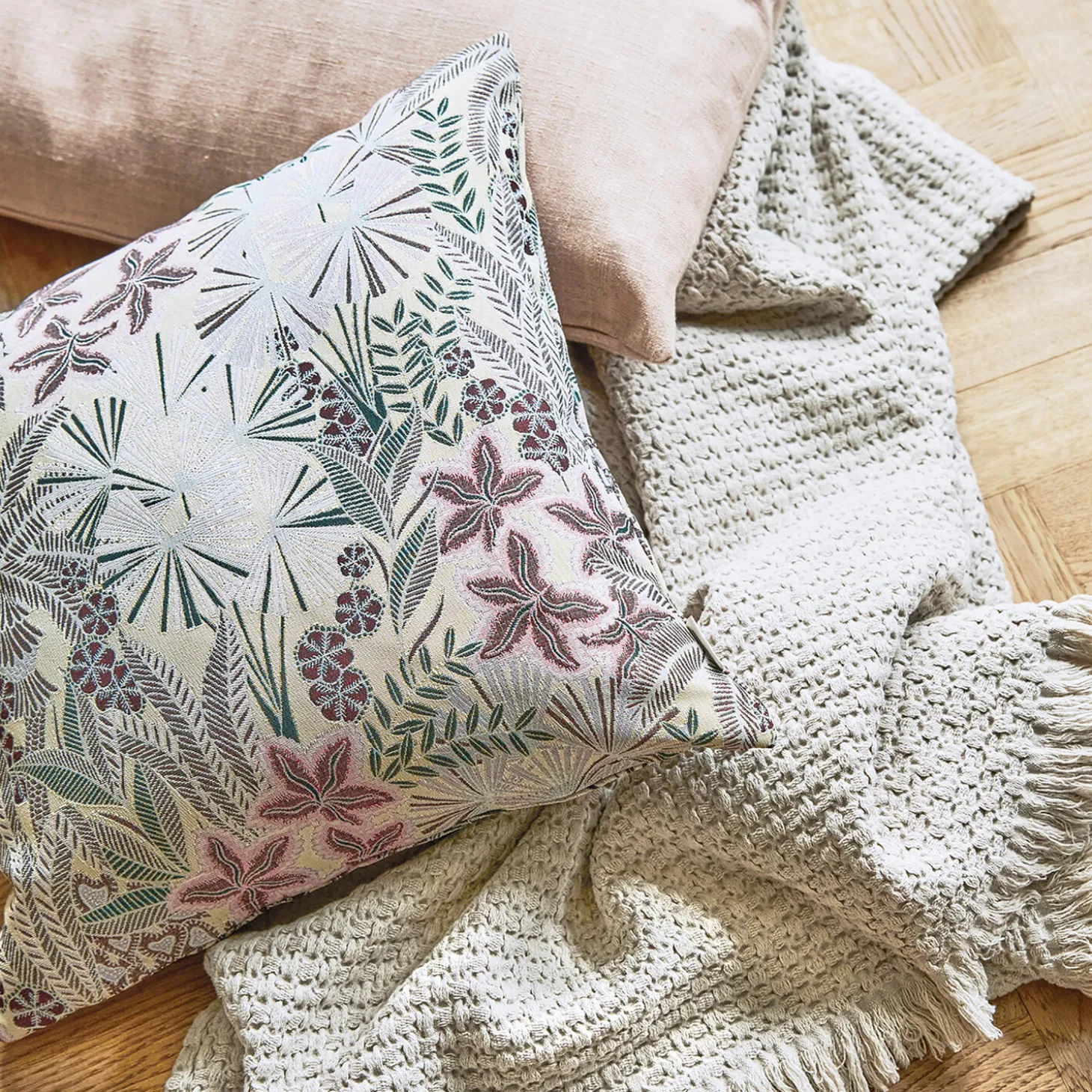 Et levende mix af blomster og blade i fine douche farver. Den sprudlende Fantasy pude i rosa er en hurtig genvej til at ramme sæsonens livlige look. Hver Fantasy pude fremstår unik og kan variere i design.