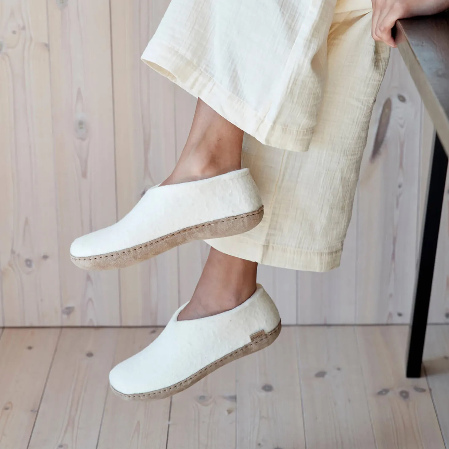 Filtsko af 100% ren naturlig uld med en sål af blødt kalveskind. Formen på skoen følger fodens konturer og sikrer, at skoen bliver på plads. Skoen er fleksibel og holder foden varm og tør på grund af uldens egenskaber, da den har stor evne til at absorbere fugt.