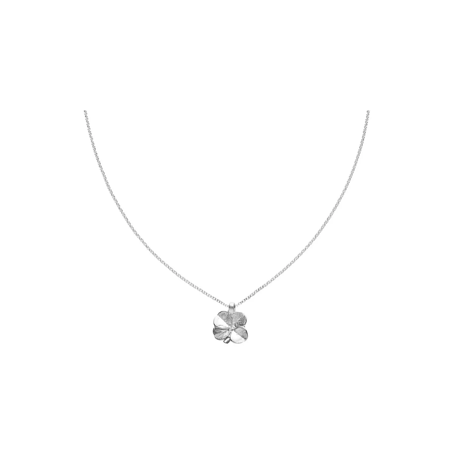 Det ikoniske lille firkløver vedhæng har været Flora Danicas bestseller gennem mere end syv årtier. Designet har naturen selv stået for, og den oprindelige struktur og små fine detaljer i firkløveren er vel bevaret. Firkløveret, der blev brugt til dette vedhæng blev plukket i Danmark i 1952 og sidder på en elegant kæde, der kan justeres i længden (fra 40 til 45 cm). Firkløverens fire blade repræsenterer tro, håb, kærlighed – og det fjerde og meget sjældne blad repræsenterer held. Kun en ud af 10.000 kløvere er firkløver. Firkløveren er Flora Danicas signatur. Vedhæng og kæde er udført i sterlingsølv belagt med rhodium.