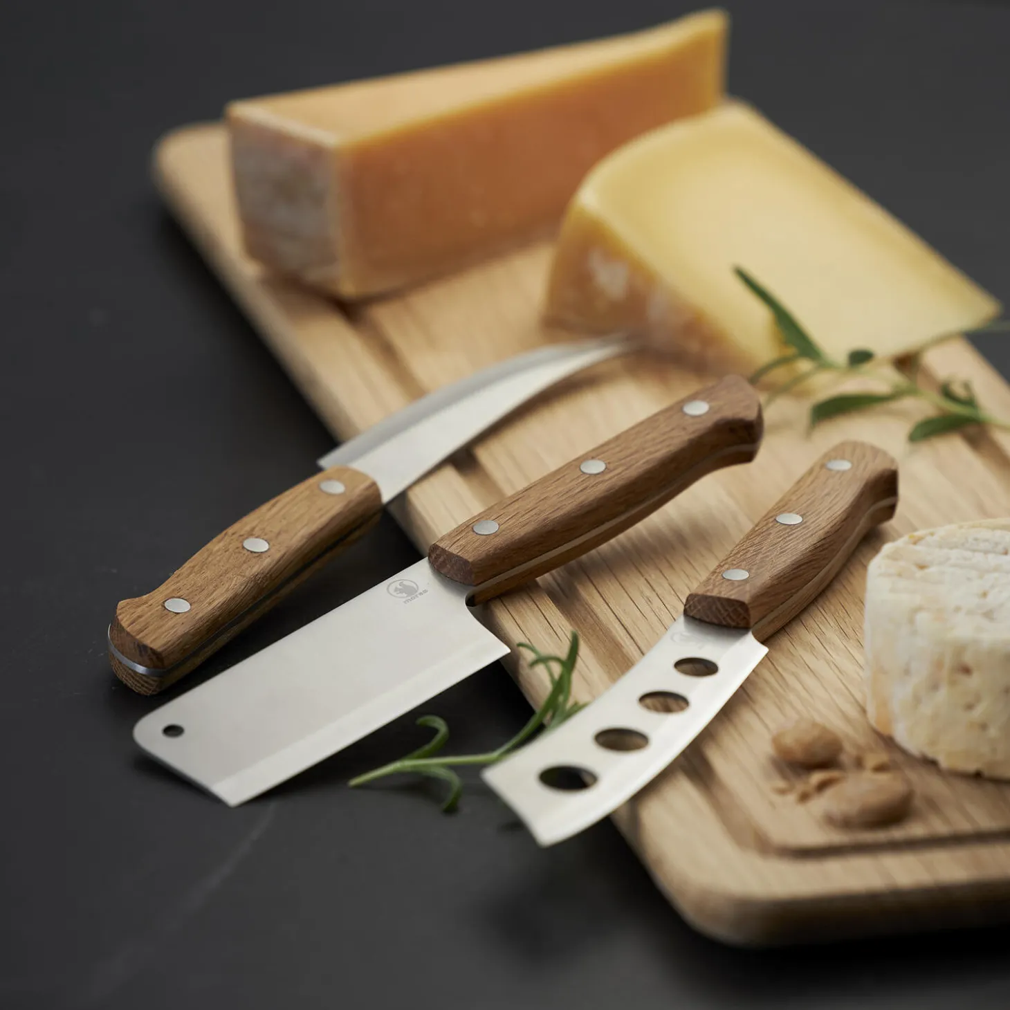 Ostesættet med tre osteknive er det perfekte tilbehør til osteanretningen. Knivbladene er udført i rustfrit kvalitetsstål og håndtagene i olieret eg, som ved brug vil udvikle patina og blot blive smukkere, jo mere knivene bruges. Træhåndtagene er udformet af ét stykke træ og er behagelige at holde om. Vaskes med varmt vand og mild sæbe og tørres straks efter. Ikke egnet til opvaskemaskine.