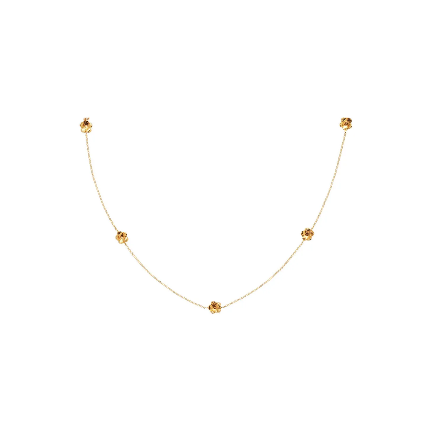 Vedhænget med kæde er en nyhed blandt forglemmigej i Flora Danicas 70-års jubilæums kollektion. Forglemmigej er blandt de bedst sælgende kollektioner siden 1952 og symboliserer troskab, kærlighed og venskab. Smykket har fem små guldbelagte forglemmigej blomster på en fin kæde i justerbar længde (50, 55, 60 cm). Med sit enkle og elegante design er kæden perfekt at bruge til både hverdag og fest. Smykket er udført i 22 karat forgyldt sterlingsølv. Blomsterne måler hver 6 mm i diameter.