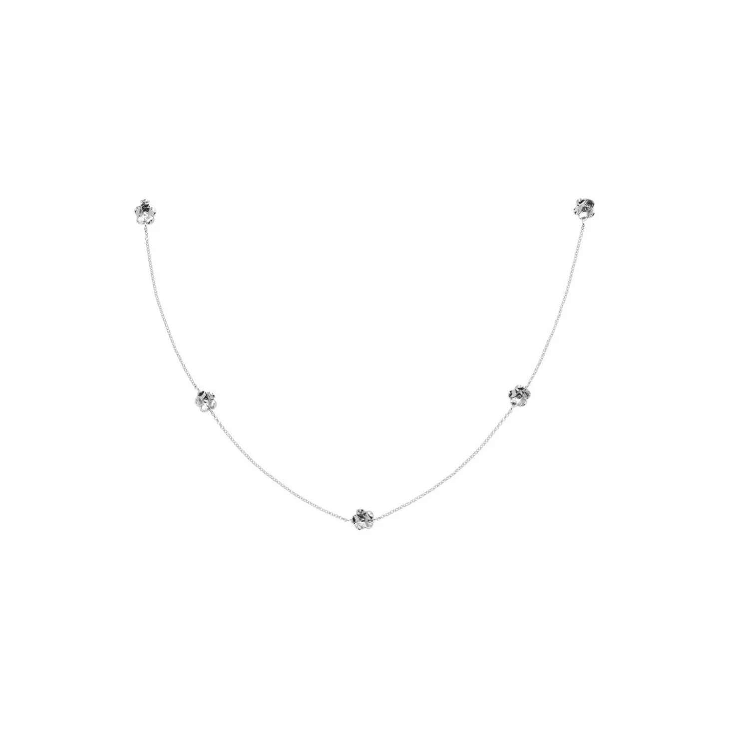Vedhænget med kæde er en nyhed blandt forglemmigej i Flora Danicas 70-års jubilæums kollektion. Forglemmigej er blandt de bedst sælgende kollektioner siden 1952 og symboliserer troskab, kærlighed og venskab. Smykket har fem små guldbelagte forglemmigej blomster på en fin kæde i justerbar længde (50, 55, 60 cm). Med sit enkle og elegante design er kæden perfekt at bruge til både hverdag og fest. Smykket er udført i 925 sterlingsølv belagt med rhodium. Blomsterne måler hver 6 mm i diameter.