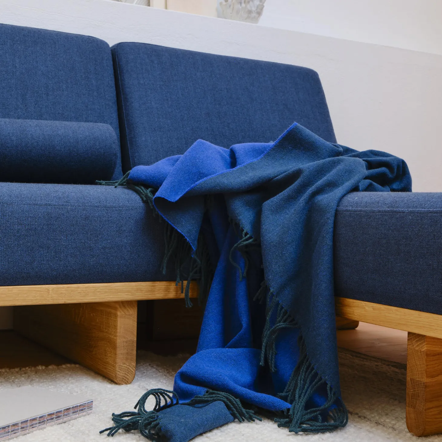 Franja er vævet i 50% alpaka og 50% uld. ‘Franjas’ smukke farver, ‘Butter Peach’ og ‘Burgundy Blue’, tilføjer plaiderne et smukt udtryk til hjemmets mange hyggelige kroge.