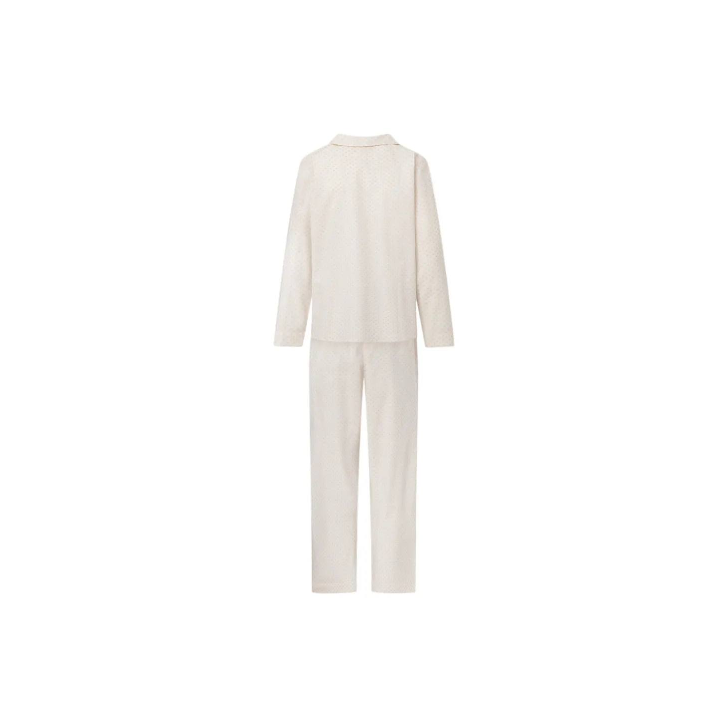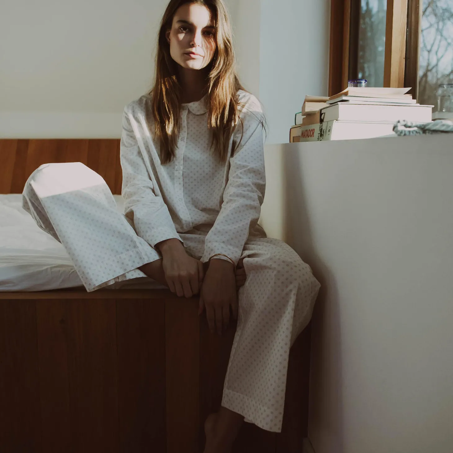 Stilfuld, lækker og blød pyjamas, som både er hyggelig at have på og pæn at se på.Pyjamassen er i økologisk bomuldspoplin. Skjorten har gennemknappet stolpelukning og en fin, lille rund krave, der giver et feminint touch. Pyjmasbukserne er løse og har elastik i taljen og sidelommer. Alle indvendige syninger er med franske sømme for en delikat, luksuriøs finish.