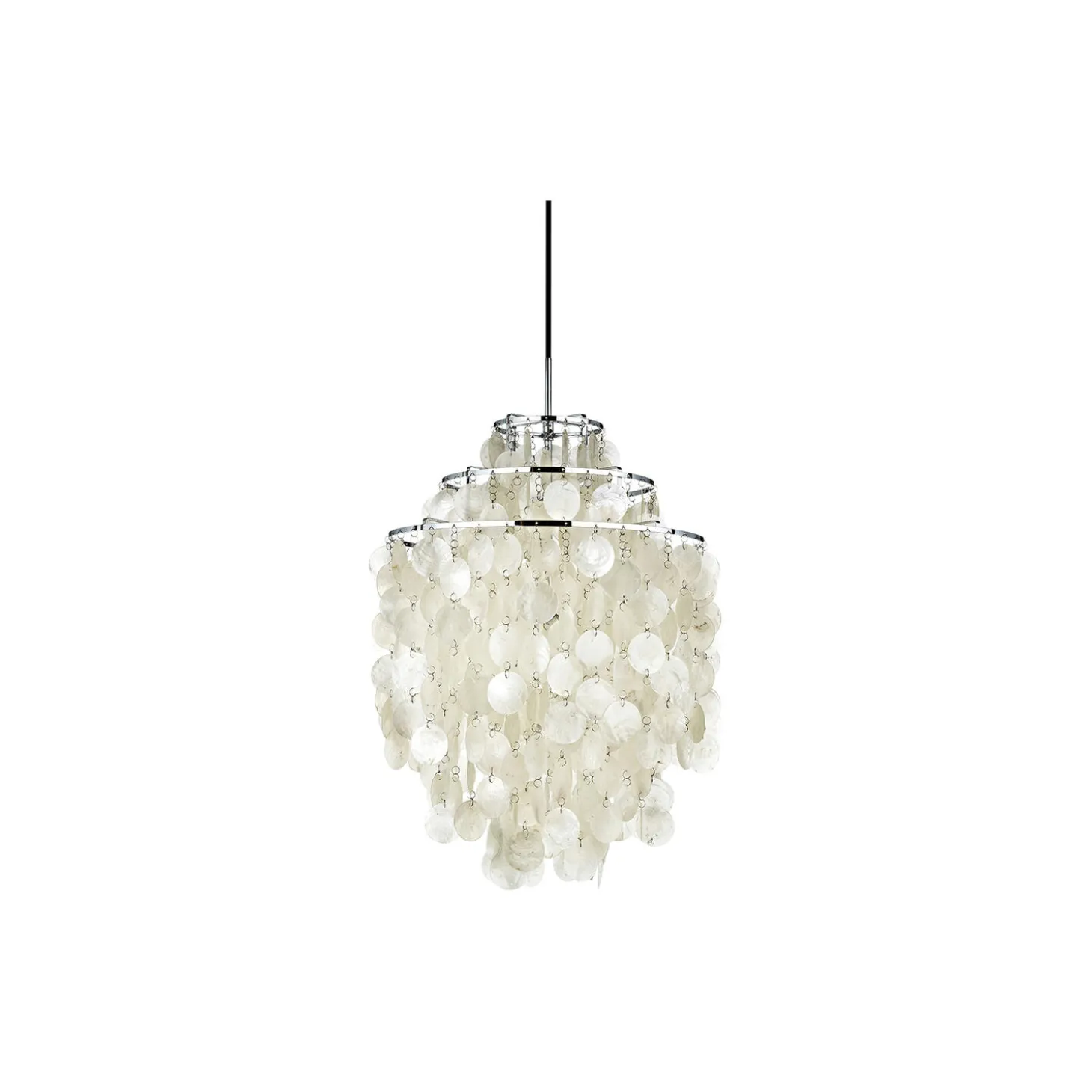 Fun 1DM pendel med perlemorsskaller og ringe i forkromet rustfrit stål fra Verpan. Farve: perlemor. Mål: H: 60 x Ø 45 cm. Lyskilde: maks. 60W E27. Design: Verner Panton.